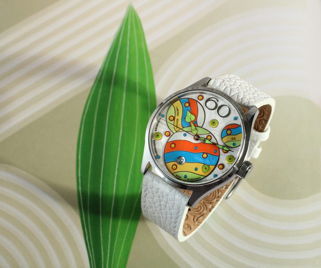 Zůstávají věrné hravému konceptu barevných, kulatých prvků, ale interpretují ho zcela novým způsobem. Barevné koule se víří po ciferníku jako kreativní balet. Velké koule září v pruhované, duhové perleti, zatímco ty menší se blýskají v jasných barvách – dokonale sladěné. Jemně zvlněný gilošovaný ciferník v bílé barvě poskytuje klidné, ale vzrušující pozadí.