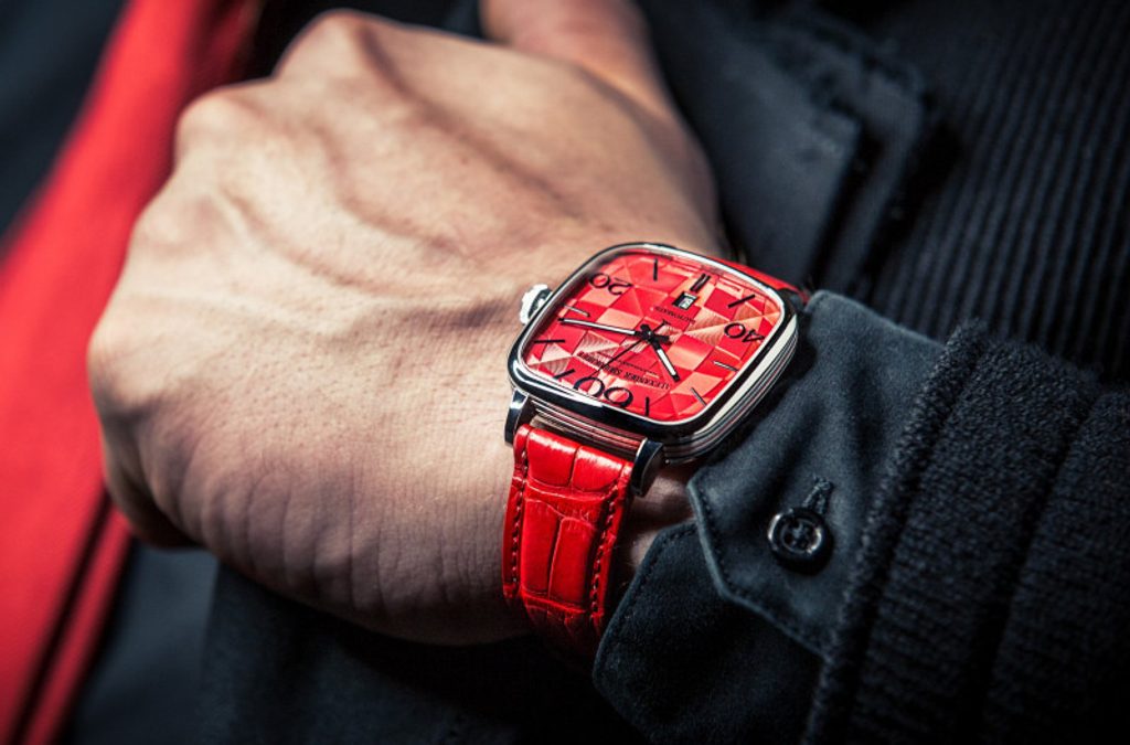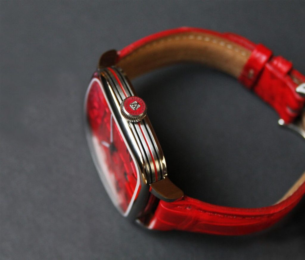 Gravírovaný ciferník ve tvaru čtverců je typickým představitelem kubismu, jednoho z avantgardních uměleckých směrů. Na dýnku najdeme čtyři kulaté průhledné otvory, které prozrazují krásu ručně gravírovaného strojku. Hodinky jsou vhodné pro všechny, kdo dokáží ocenit malé uměleckém dílo v průmyslovém ztvárnění.