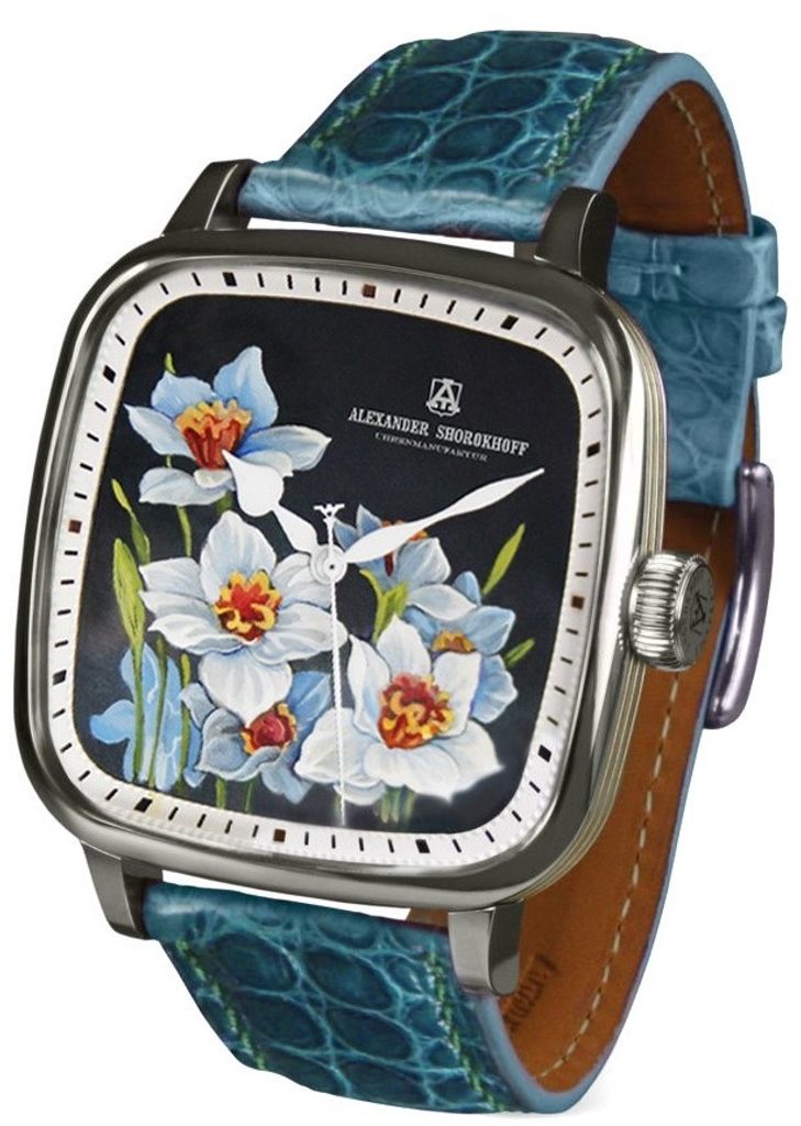 Jedinečné dámské hodinky Alexander Shorokhoff Kandy Daffodils AS.KD01-LIL patří do modelové řady Avantgarde. Vůbec poprvé použil Alexander Shorokhoff miniaturní malbu v modelech Daffodils a Bouquet, čímž vznikly úžasné a typicky ženské hodinky. Bleděmodré narcisy skoro až září na kontrastním černém pozadí z přírodní perleti. Jejich nevinná běloba vyvolává pocity něhy a melancholie.