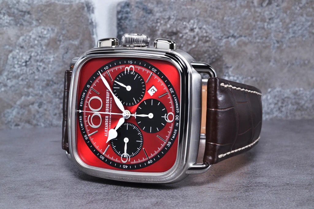 V novém chronografu Square&Round AS.SR02-6 si hraje přesně s těmito různými barvami, tvary a kontrasty. Barvy jsou jednoznačně hlavním znakem nové řady. Pro červenou byl zvolen tmavší a silnější, ale stále teplý odstín, černá zůstává přízemní a vážná a je realizována v polomatném provedení. Odpovídající kontrastní barvy pro modely jsou černá a bílá. Vzniká tak nejen barevný, ale i pocitový kontrast. V tomto případě kontrastní odstíny teplé a studené nejsou protikladné, ale vzájemně ladí a doplňují se.