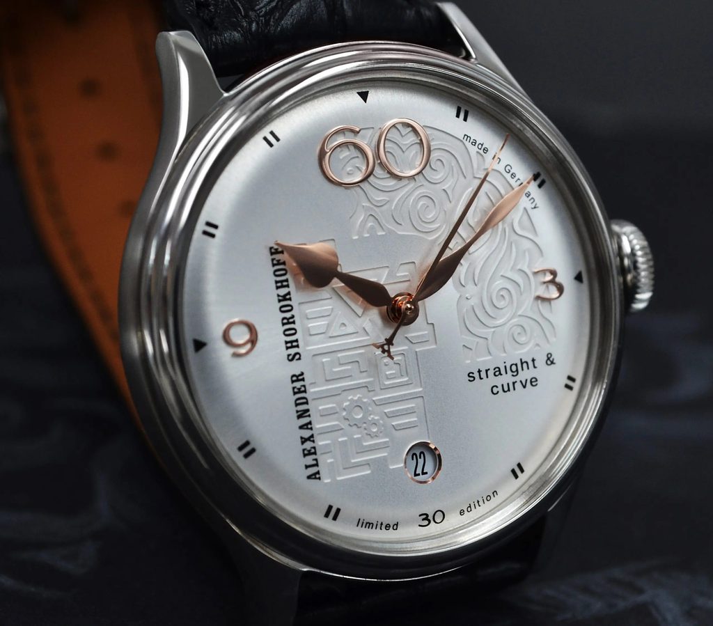 Model Straight & Curve AS.V7-SC1 kombinuje rovné linie se zakřiveními v harmonickém vzhledu. Vzory zakřivených čar se klikatí, aby odpovídaly tvaru číselníku v pravé horní části, zatímco rovné čáry nacházejí své místo vlevo od nápisu „Alexander Shorokhoff“. Vyzařuje z nich určitá protikladná harmonie, a to je to, co dělá hodinky tak výjimečnými.