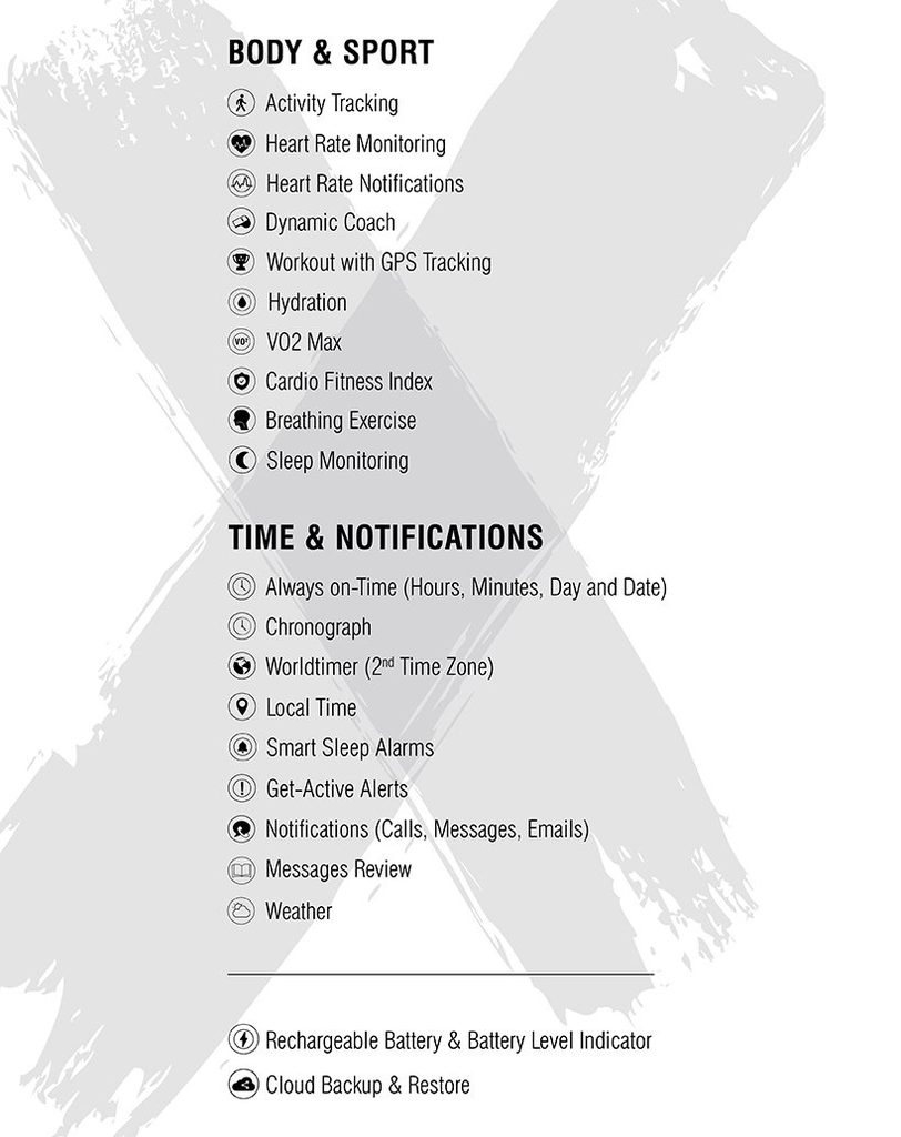 | Další funkce | Optický snímač měření srdečního tepu, GPS záznam trasy, Bluetooth, Synchronizace času a data, Monitoring spánku Sleeptracker®, Inteligentní alarm, Alarm aktivity, Adaptivní koučování, Notifikace hovorů, Duální čas, Záloha a obnova dat, Předpověď počasí |