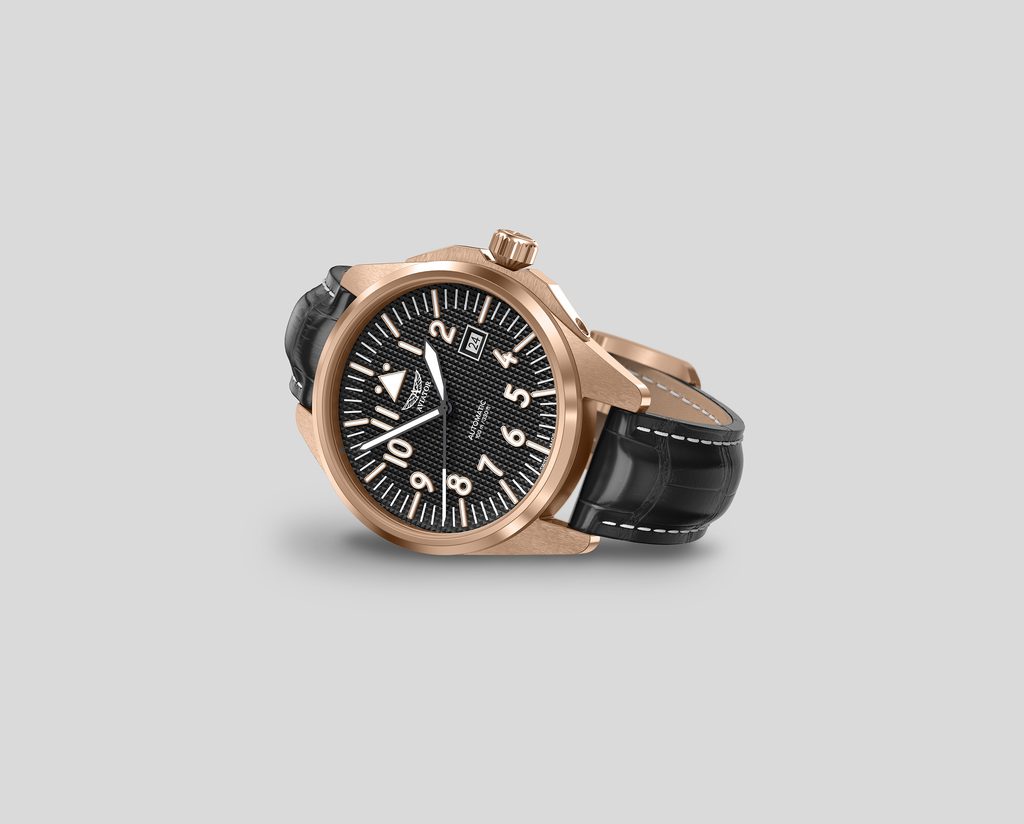 Design hodinek Aviator Airacobra, který odráží robustní, klasický vzhled s broušeným a dobře proporcionálním pouzdrem o průměru 42 milimetrů, je jako vystřižený z historie. Jeho nadměrná šroubovací korunka nabízí dobrý úchop, což je výhodné zejména v kombinaci s autentickými pilotními rukavicemi ze 40. let. Srdcem hodinek Aviator Airacobra 43 Auto V.3.39.2.339.4 je švýcarský mechanický strojek s automatickým nátahem Sellita SW200-1 s rezervou chodu kolem 38 hodin.