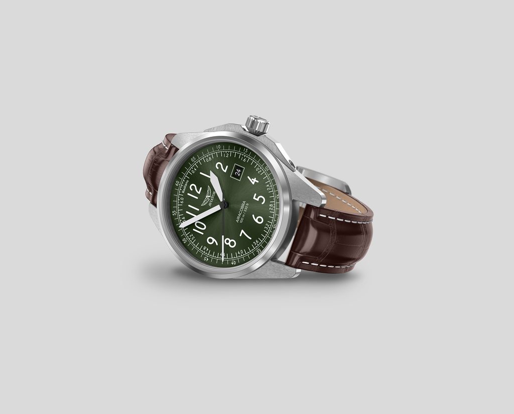 Číselník, který evokuje ducha kokpitu, je navržen s matně zrnitou strukturou, která hodinkám dodává více přístrojový dojem. Jeho minimalistické, vysoce kontrastní ručičky a číslice zajišťují vynikající přehlednost a čitelnost, zatímco datumové okénko na pozici třetí hodiny umocňuje jeho jedinečný design. Každý detail byl promyšlen tak, aby se snoubil s autenticitou a vzhledem inspirovaným letectvím.