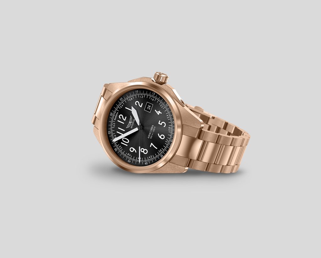 Číselník, který evokuje ducha kokpitu, je navržen s matně zrnitou strukturou, která hodinkám dodává více přístrojový dojem. Jeho minimalistické, vysoce kontrastní ručičky a číslice zajišťují vynikající přehlednost a čitelnost, zatímco datumové okénko na pozici třetí hodiny umocňuje jeho jedinečný design. Každý detail byl promyšlen tak, aby se snoubil s autenticitou a vzhledem inspirovaným letectvím.