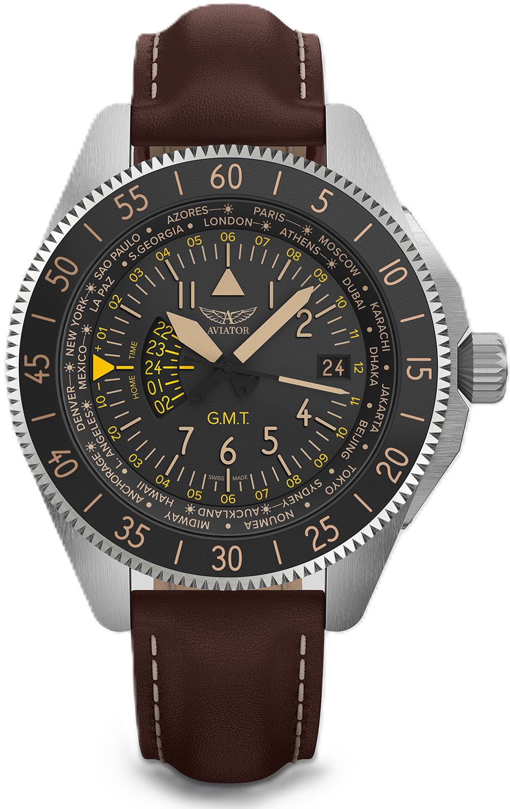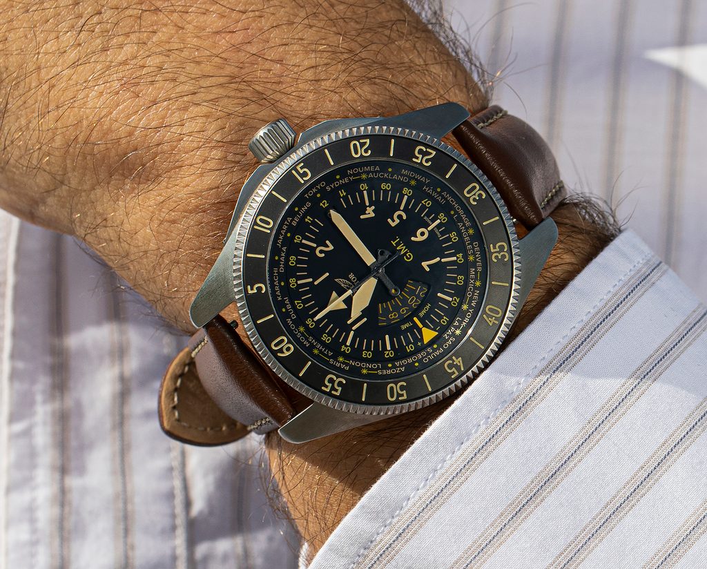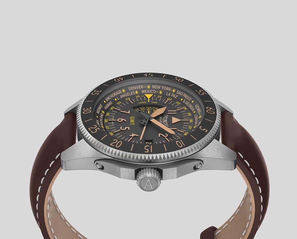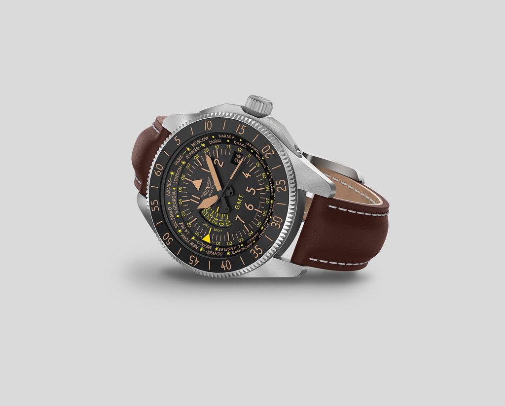 Hodinky Aviator Airacobra GMT , inspirované touto inovací, v sobě spojují styl a ergonomii, odrážejí tvar letadla a křídla ve svých lunetách a zároveň vzdávají hold letounu Airacobra. Číselník, inspirovaný přístroji letadla, vyzdvihuje viditelnost a čitelnost všech možných údajů.