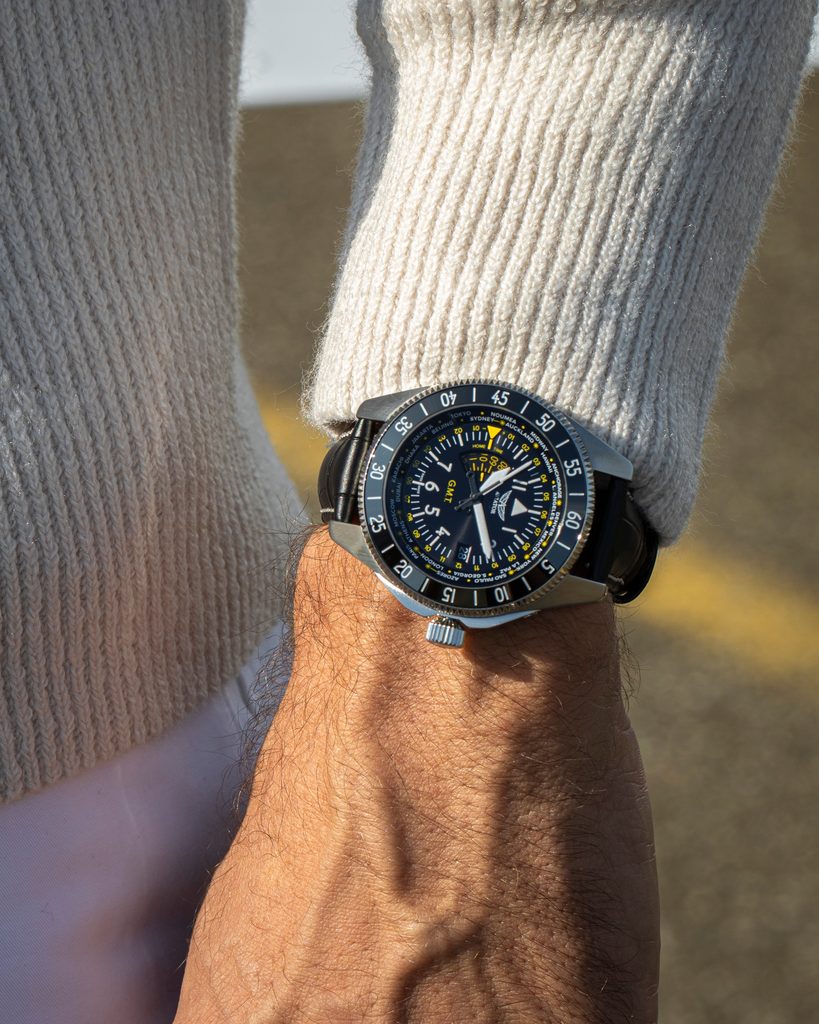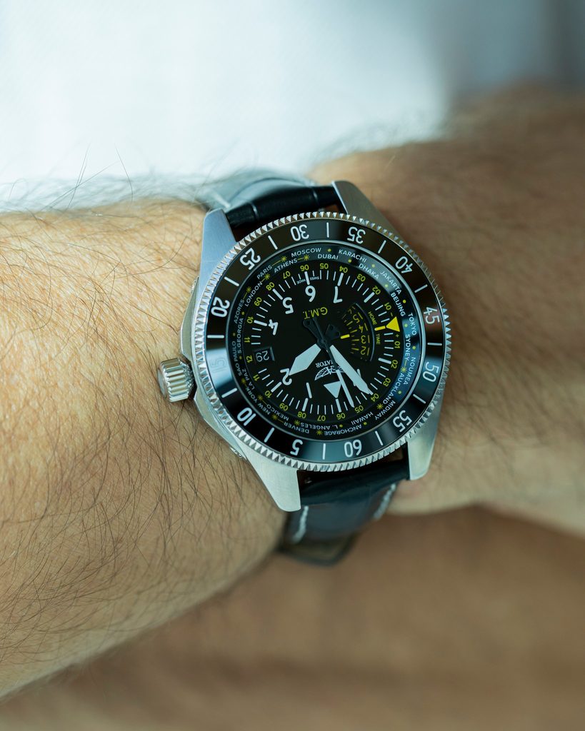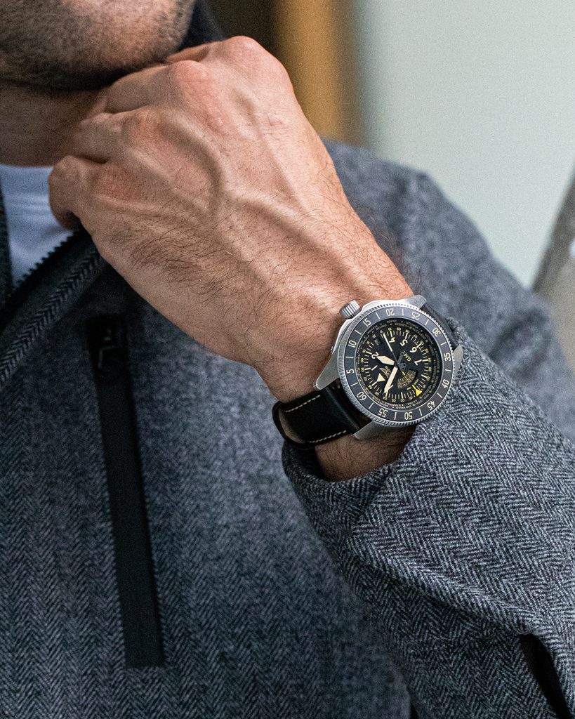 Hodinky Aviator Airacobra GMT , inspirované touto inovací, v sobě spojují styl a ergonomii, odrážejí tvar letadla a křídla ve svých lunetách a zároveň vzdávají hold letounu Airacobra. Číselník, inspirovaný přístroji letadla, vyzdvihuje viditelnost a čitelnost všech možných údajů.
