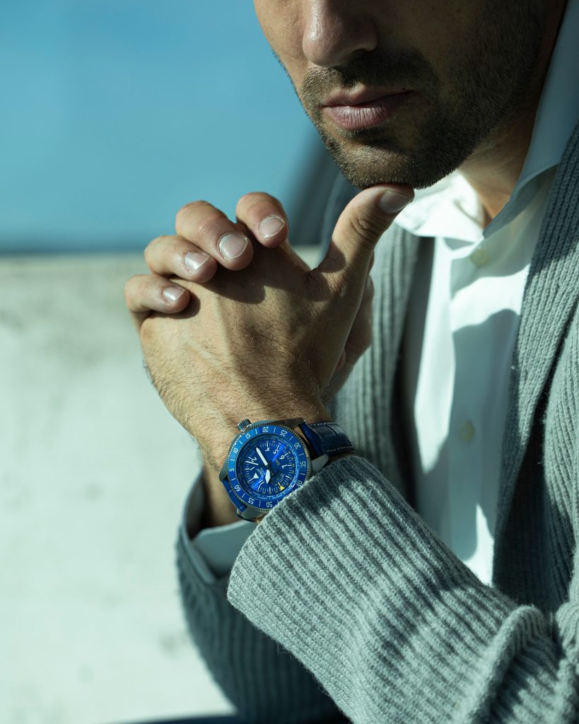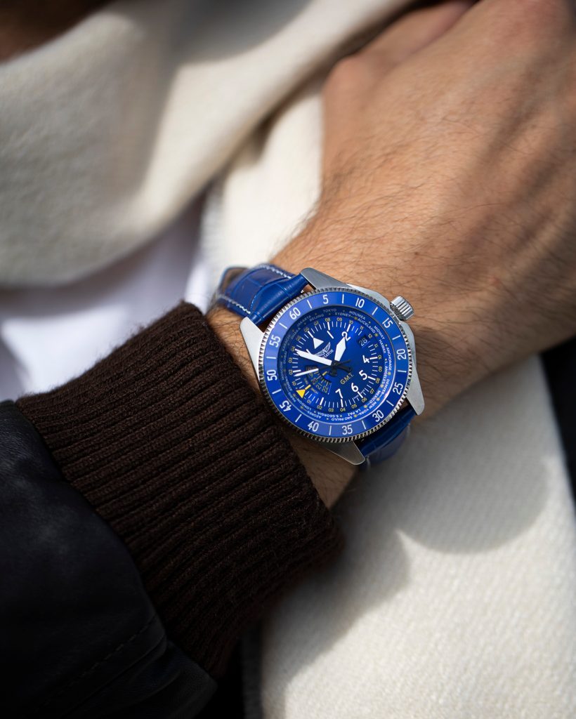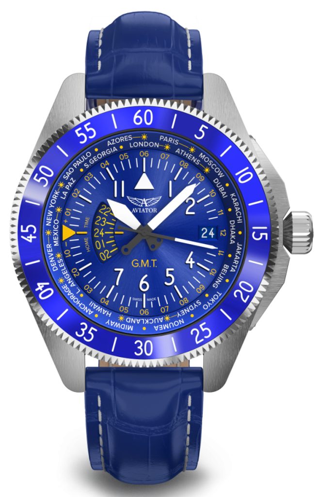 Hodinky Aviator Airacobra GMT , inspirované touto inovací, v sobě spojují styl a ergonomii, odrážejí tvar letadla a křídla ve svých lunetách a zároveň vzdávají hold letounu Airacobra. Číselník, inspirovaný přístroji letadla, vyzdvihuje viditelnost a čitelnost všech možných údajů.