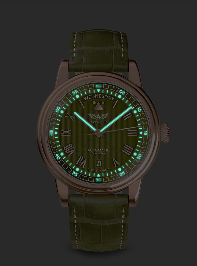 Číselník hodinek Aviator Douglas Day-Date 41 Automatic zdobí jemný 3D vzor a elegantně zakřivený ukazatel dne v týdnu. Vzhledem k tomu, že viditelnost a čitelnost jsou klíčovými atributy, kombinuje kolekce Douglas Day Date 41 design a funkčnost ve stylu Art Deco - od výrazných, dokonale vyleštěných římských číslic až po dva vyvýšené kruhy přístrojů s luminiscenčními indexy inspirovanými kokpitem. Vzor číselníku s hlubokými a jemnými drážkami vytváří úžasné barevné odlesky připomínající kovové hedvábné efekty a symbolizuje nadčasovou sofistikovanost. Vše chrání safírové sklíčko s antireflexní úpravou.