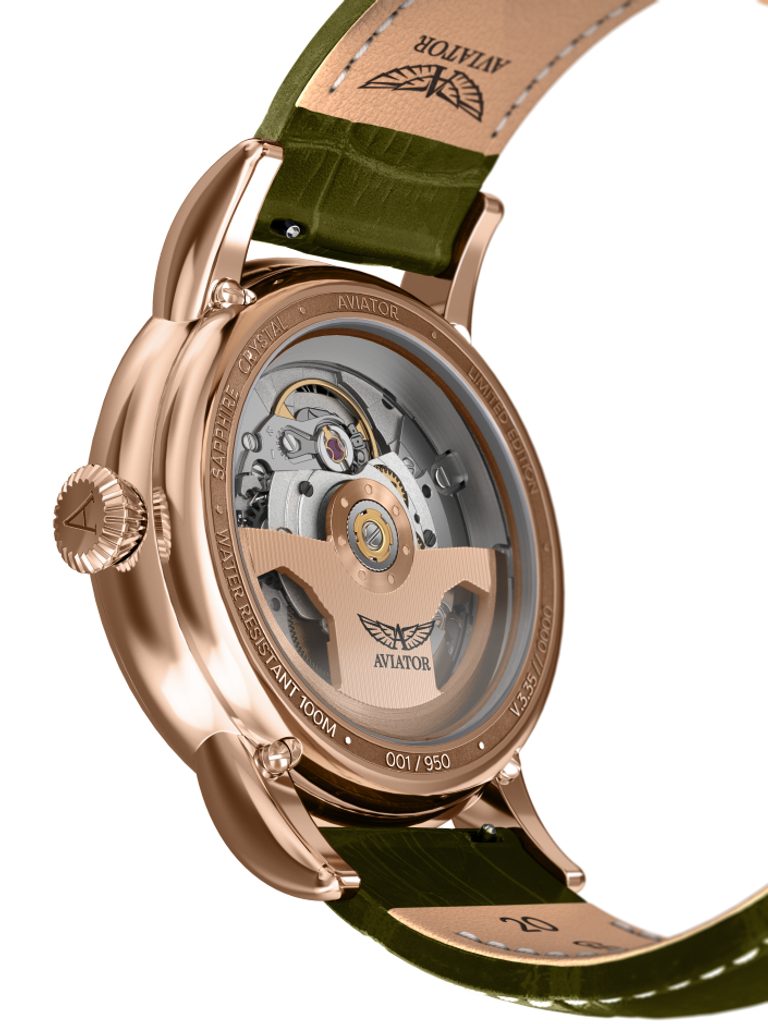 Pouzdro hodinek je vyrobeno z ušlechtilé oceli se zlatou PVD úpravou. Jeho zaoblené křivky jsou ručně opracovány jemnými hodinářskými technikami a jsou inspirovány ladnou propracovaností trupu letadla Douglas. Jeho úžasné zrcadlově leštěné plochy jsou zefektivněny ergonomicky uhlazenými liniemi. Protože každé pouzdro Aviator je výsledkem vysoce precizní konstrukce a ergonomie, získáte dobře navržené proporce a rozměry pouzdra v souladu se všemi ostatními prvky hodinek.