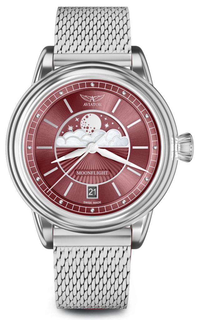Zlatý věk letectví přinesl do cestování novou úroveň sofistikovanosti. Módní návrháři vnesli do návrhů ocelových letadel a uniforem palubních průvodčích extravaganci a kumšt. Noční lety na palubách letadel Douglas DC-3 nabízely luxusní vybavení a velkolepou mystiku měsíce za okny - od západu do východu slunce. Inspirován touto érou luxusu a tajemnou přitažlivostí Měsíce přináší Aviator MoonFlight eleganci na dosah ruky. Barevná paleta, lesklé hladké povrchy a sluneční giloše jsou skutečně velmi podobné 30. letům minulého století. Obláčky vyrobené z čisté perleti evokují krásnou jednoduchost s nádechem módy flapper, zatímco fascinující disk měsíčních fází zachycuje noční oblohu, jak zářila před mnoha měsíci a bude zářit i nadále.