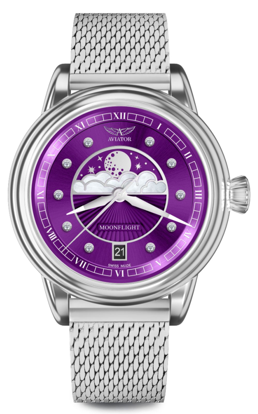 Zlatý věk letectví přinesl do cestování novou úroveň sofistikovanosti. Módní návrháři vnesli do návrhů ocelových letadel a uniforem palubních průvodčích extravaganci a kumšt. Noční lety na palubách letadel Douglas DC-3 nabízely luxusní vybavení a velkolepou mystiku měsíce za okny - od západu do východu slunce. Inspirován touto érou luxusu a tajemnou přitažlivostí Měsíce přináší Aviator MoonFlight eleganci na dosah ruky. Barevná paleta, lesklé hladké povrchy a sluneční giloše jsou skutečně velmi podobné 30. letům minulého století. Obláčky vyrobené z čisté perleti evokují krásnou jednoduchost s nádechem módy flapper, zatímco fascinující disk měsíčních fází zachycuje noční oblohu, jak zářila před mnoha měsíci a bude zářit i nadále.