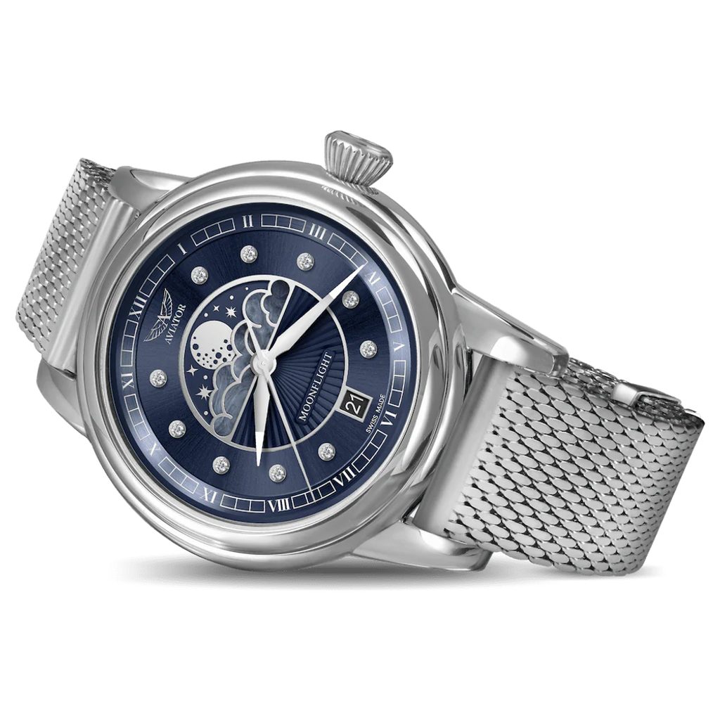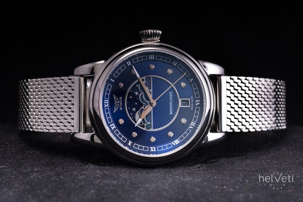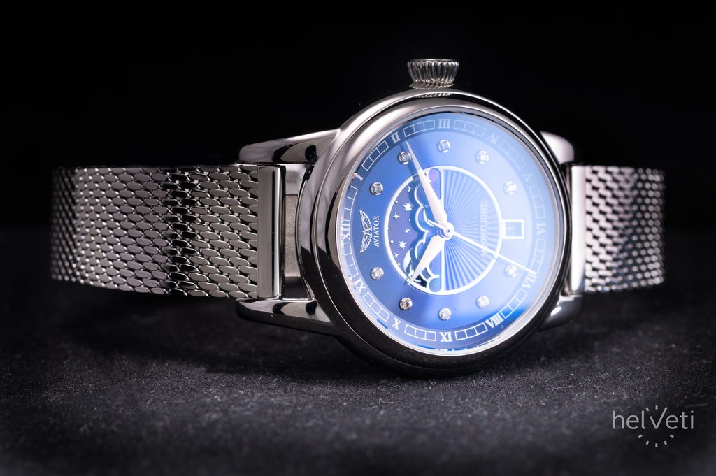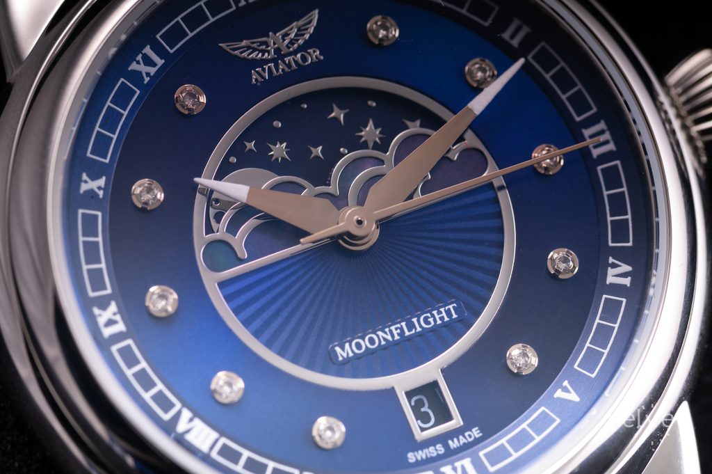 O vlivu Měsíce na naši Zemi a veškerý život na ní už nikdo nepochybuje. Ovlivňuje náš spánek a naše myšlení nebo vzestup a pokles oceánů a moří. Během 8 fází, kterými Měsíc prochází každých 29,5 dne, se intenzita jeho síly mění. Dámské hodinky Aviator Moonflight jsou navrženy tak, abyste tyto fáze mohli kdykoli sledovat pohledem na hodinky.