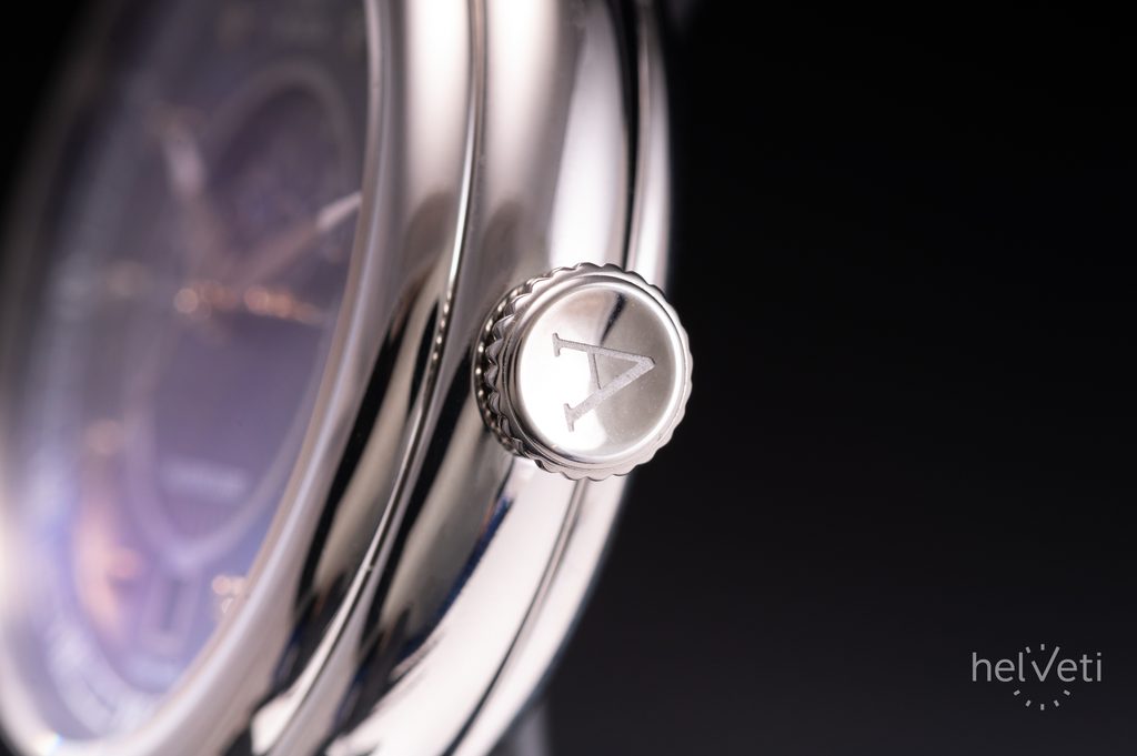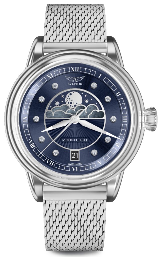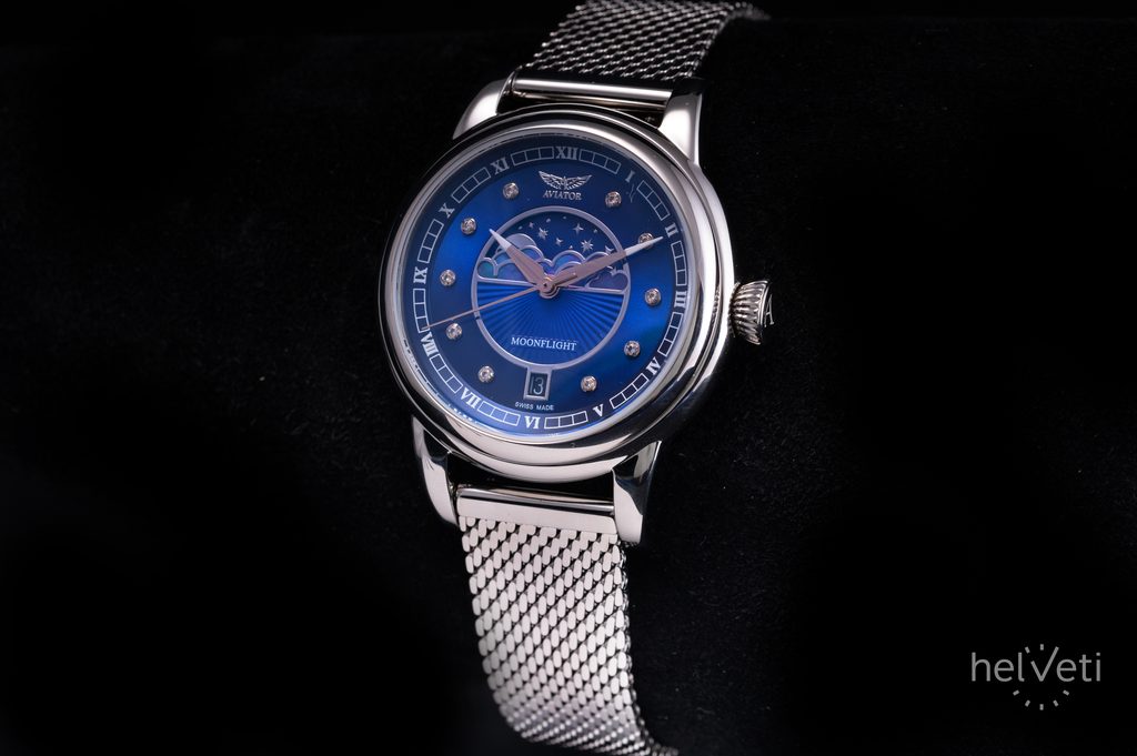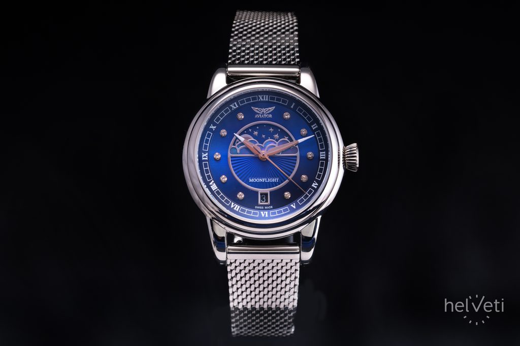 Zlatý věk letectví přinesl do cestování novou úroveň sofistikovanosti. Módní návrháři vnesli do návrhů ocelových letadel a uniforem palubních průvodčích extravaganci a kumšt. Noční lety na palubách letadel Douglas DC-3 nabízely luxusní vybavení a velkolepou mystiku měsíce za okny - od západu do východu slunce. Inspirován touto érou luxusu a tajemnou přitažlivostí Měsíce přináší Aviator MoonFlight eleganci na dosah ruky. Barevná paleta, lesklé hladké povrchy a sluneční giloše jsou skutečně velmi podobné 30. letům minulého století. Obláčky vyrobené z čisté perleti evokují krásnou jednoduchost s nádechem módy flapper, zatímco fascinující disk měsíčních fází zachycuje noční oblohu, jak zářila před mnoha měsíci a bude zářit i nadále.