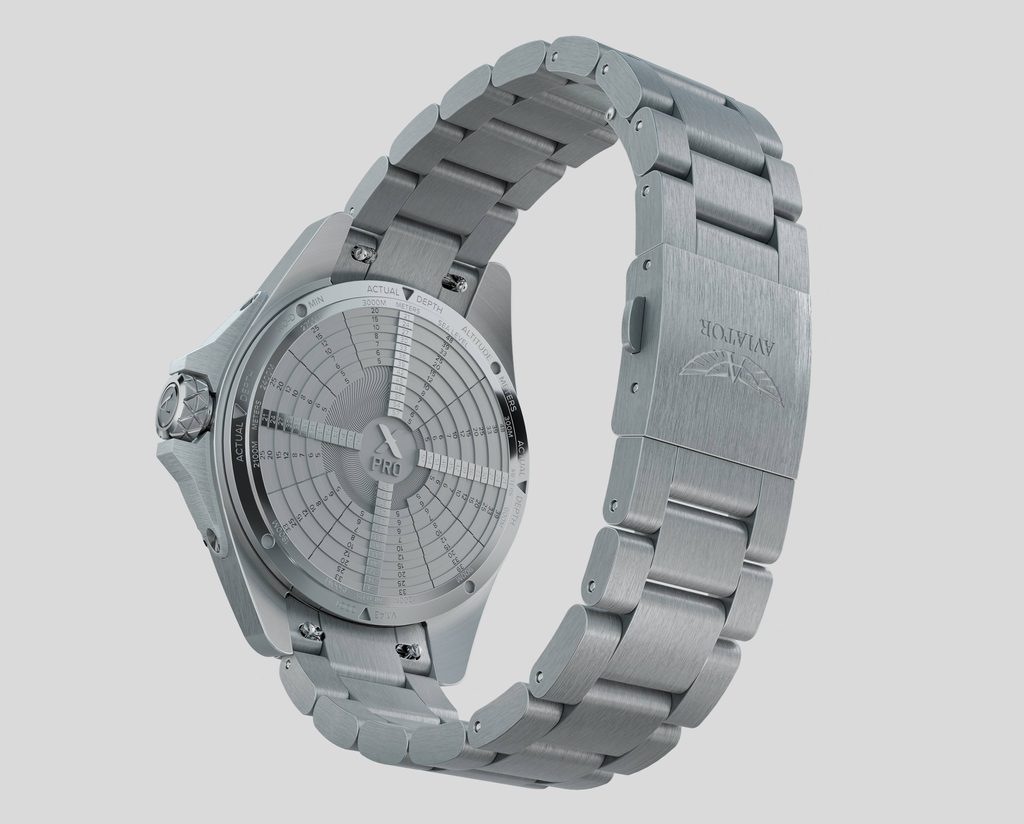 Zadní strana pouzdra hodinek XPRO DIVE je vícevrstvá umění s jemně gravírovanými informacemi, která kombinuje hloubku designu s funkčním účelem. Zobrazuje tabulku nadmořských výšek bez dekomprese, unikátně adaptovanou z potápěčské příručky amerických námořních SEALs, která nabízí jasný přehled o tom, jak se bezpečné limity mění s nadmořskou výškou. Spojením těchto referencí s funkcí odpočítávání na lunetě mohou potápěči přesně plánovat a sledovat svůj čas. Povrch kombinuje kartáčované, leštěné a pískované povrchy, zatímco centrální spirála zdůrazňuje extrémní expozici – vizuální připomínku, že takové ponory vyžadují konzultaci specialisty s lékařem.