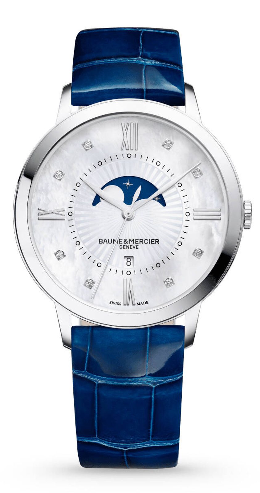 Baume & Mercier Classima jsou klasické hodinky s kulatým pouzdrem a dokonale vyváženými proporcemi, které je radost nosit. V jejich designu se snoubí dotek modernosti s pestrou paletou použitých materiálů. Baume & Mercier Classima 10226 s ukazatelem fáze měsíce jsou trvalou klasikou, nadčasovým modelem, který působí jednoduchým, avšak zároveň luxusním dojmem.