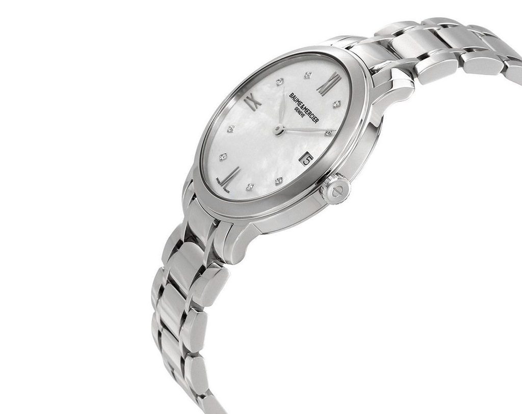 Model Baume & Mercier Classima M0A10326 má jednoduchý perleťový číselník doplněný stříbrnými aplikovanými římskými číslicemi, střídajícími se na hodinových pozicích s 8 diamanty. Celek vhodně dotváří jemné stříbrné listové ručky. Číselník chrání safírové sklíčko s vysokou odolností proti poškrábání.