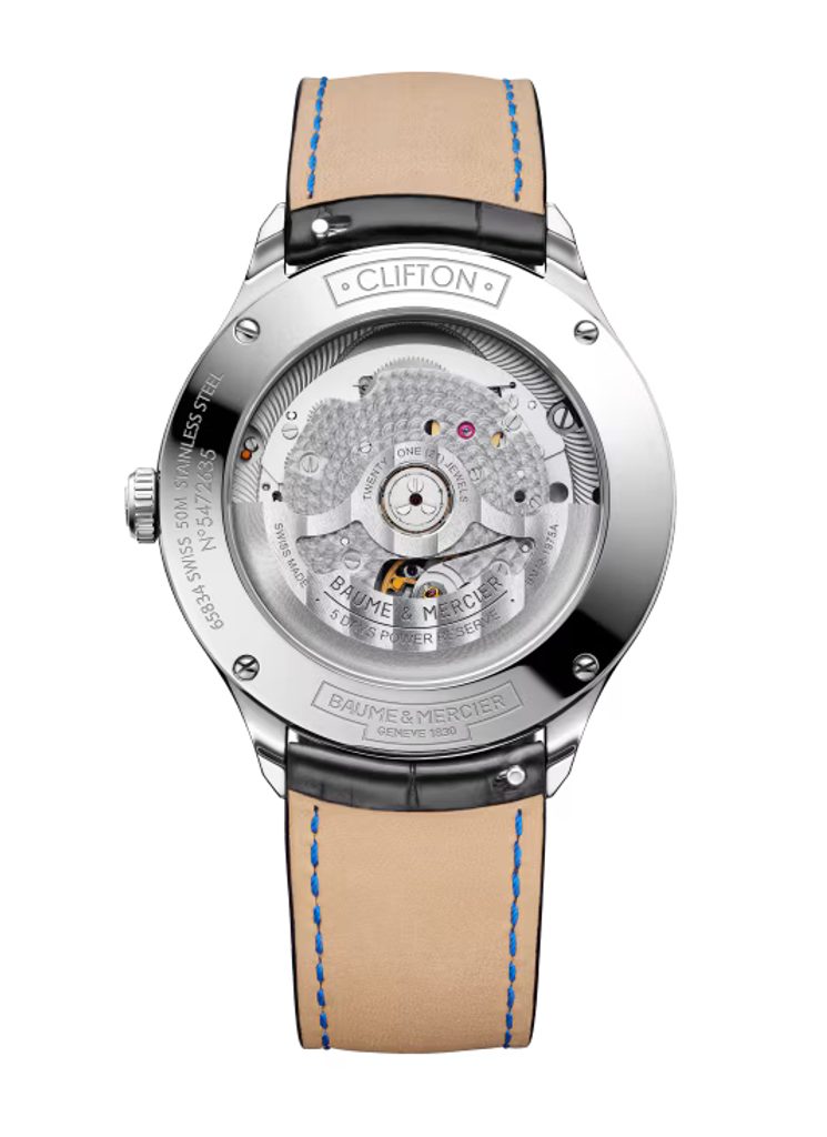 Model Baume & Mercier Clifton M0A10436 má lakovaný číselník bílé barvy. O přehlednost se starají kontrastní stříbrné alfa ručky a plastické jehlové indexy na hodinových pozicích. Hodinky pohání mechanický strojek vlastní výroby Baumatic BM12-1975A COSC s úctyhodnou rezervou chodu 120 hodin. Strojek s automatickým nátahem a frekvencí 28800 polokmitů za hodinu nabízí možnost nátahu korunkou, funkci zastavení vteřinovky při nařizování času (hacking) a nechybí ani praktická funkce data na klasické pozici 3. hodiny. Strojek potěší COSC certifikací a přesností chodu v rozmezí pouhých -4 až +6 s/den.