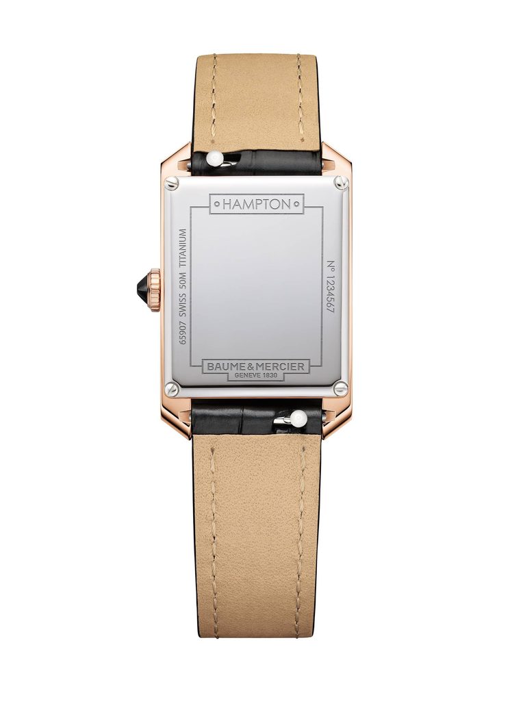 Číselník hodinek, tvořený hladkým středem a strukturovaným obvodem, chrání safírové sklíčko s vysokou odolností proti poškrábání. Eleganci těchto hodinek umocňuje obdélníkový tvar pouzdra, detailní propracování a syntetický černý spinel zasazený do korunky, které z hodinek dělá šperk. Pouzdro z 18k růžového zlata s titanovým dýnkem je doplněno černým řemínkem z aligátora zakončeným trnovou sponou. Kožený řemínek je navíc vybaven systémem rychloupínání a jeho případná výměna je tak velmi snadná i bez použití nástrojů. Voděodolnost tohoto modelu je 50 m. Rozměr pouzdra je pro dámská zápěstí ideálních 34,9 mm na výšku a 22 mm na šířku.