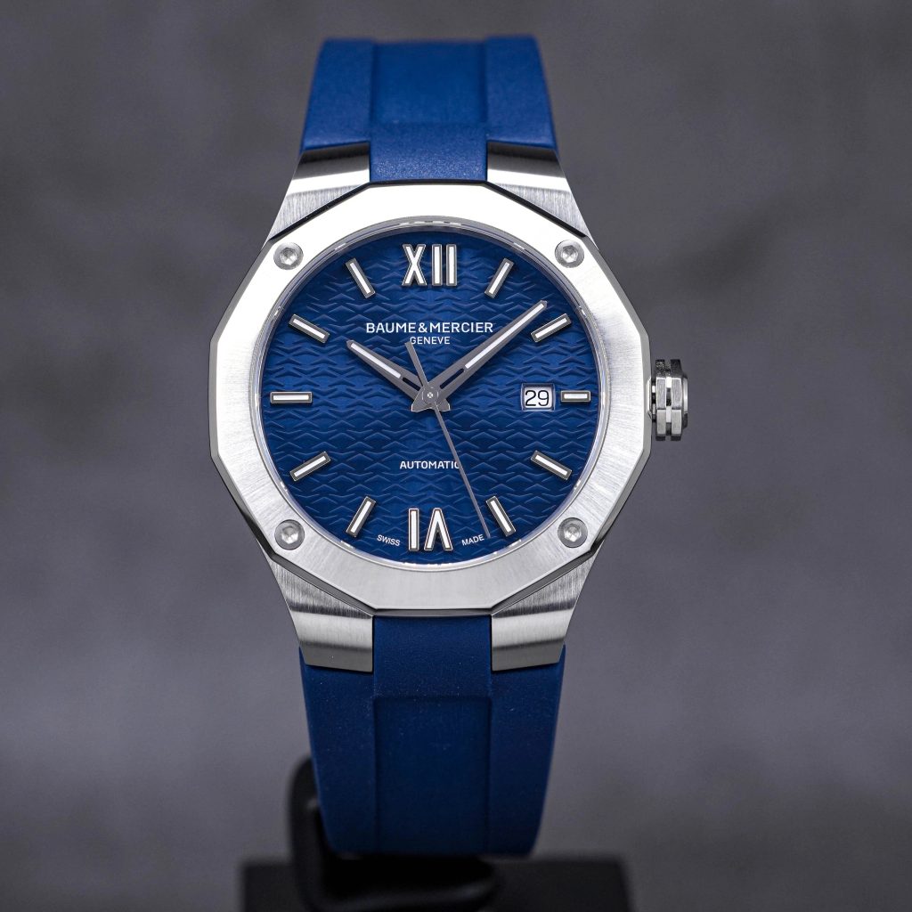 Model Baume & Mercier Riviera M0A10619 má modrý jemně broušený číselník s typickou strukturou, doplněný kontrastními stříbrnými ručkami a plastickými indexy na hodinových pozicích. Hodinky pohání mechanický strojek s automatickým nátahem Sellita SW200 s rezervou chodu kolem 38 hodin. Strojek s frekvencí 28800 polokmitů za hodinu nabízí možnost nátahu korunkou, funkci zastavení vteřinovky při nařizování času (hacking) a data na pozici 3. hodiny.