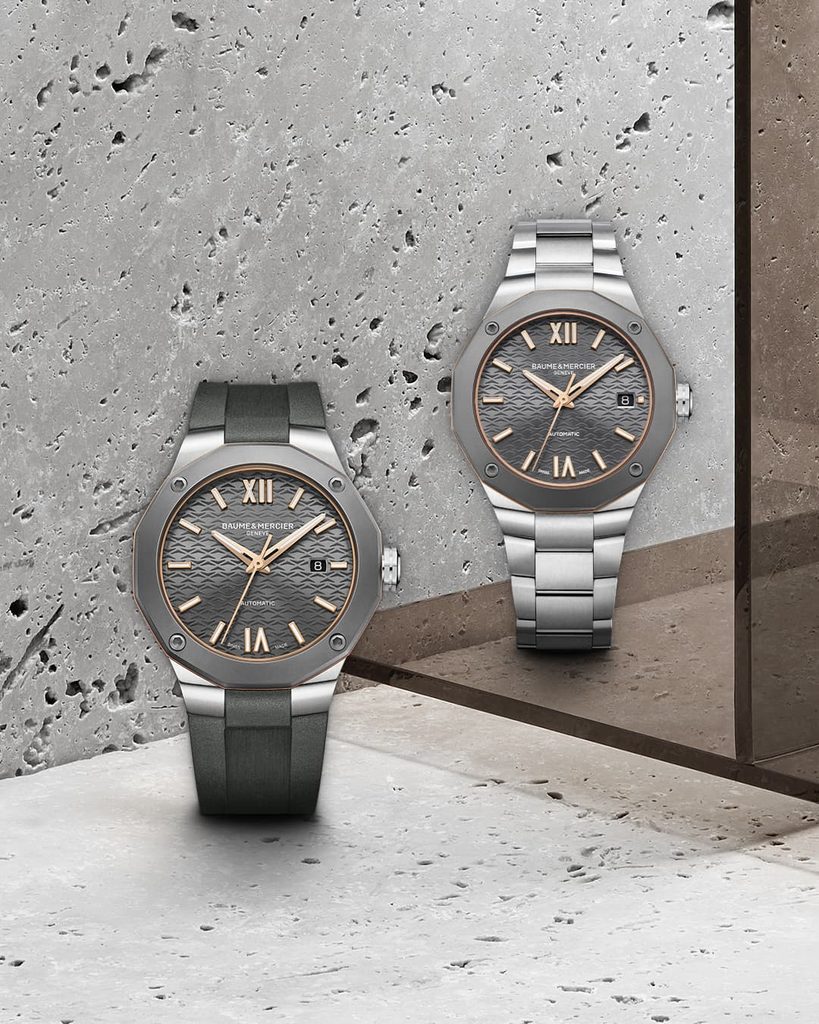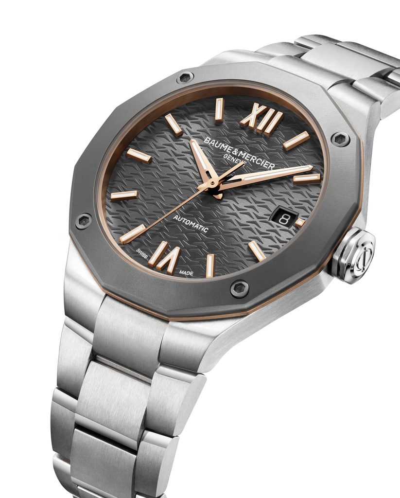 Model Baume & Mercier Riviera M0A10661 má břidlicově šedý číselník s typickou strukturou, doplněný kontrastními růžovozlatými ručkami a plastickými indexy na hodinových pozicích. Středem pouzdra se ve stejném barevném provedení vine jemná zlacená linka, dodávající hodinkám jiskru.