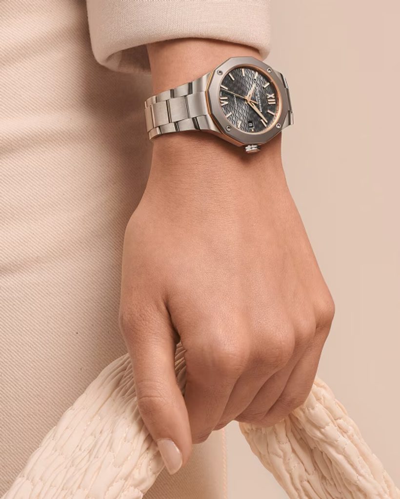 Ocelové pouzdro hodinek s břidlicově šedou pískovanou titanovou lunetou, v je doplněno třířadým náramkem zakončeným motýlovou sponou. Právě 4 funkční šrouby v lunetě, saténovaný povrch a integrovaný náramek podporují sportovní nádech hodinek. Náramek je navíc vybaven systémem rychloupínání a případná výměna za řemínek je tak velmi snadná i bez použití nástrojů. Lepší čitelnost při zhoršených světelných podmínkách zajišťuje luminiscence Super-LumiNova C1 umístěná na ručkách a indexech. Voděodolnost tohoto modelu je 50 m. Průměr pouzdra je nejen pro dámská zápěstí ideálních 36 mm.