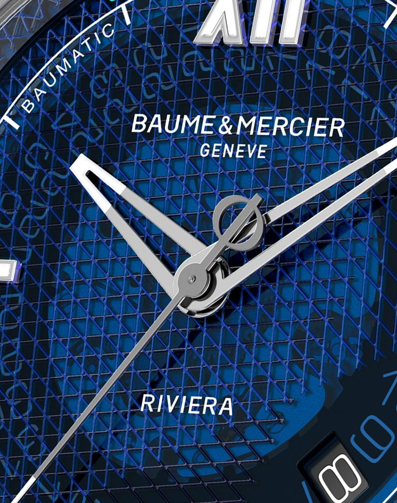 Model Baume & Mercier Riviera M0A10701 má safírový průhledný číselník modré barvy, odhalující pohled do nitra hodinek. O přehlednost se starají kontrastní stříbrné skeletované ručky a plastické indexy na hodinových pozicích. Pěkným detailem je vteřinovka, na jejímž konci tvoří protizávaží logo značky v podobě symbolu Fí. Do středu pouzdra byla umístěna vložka z modrého eloxovaného hliníku, dodávající hodinkám jiskru. Hodinky pohání mechanický strojek vlastní výroby Baumatic BM13-1975A s úctyhodnou rezervou chodu 120 hodin. Strojek s automatickým nátahem a frekvencí 28800 polokmitů za hodinu nabízí možnost nátahu korunkou, funkci zastavení vteřinovky při nařizování času (hacking) a data na pozici půl páté.