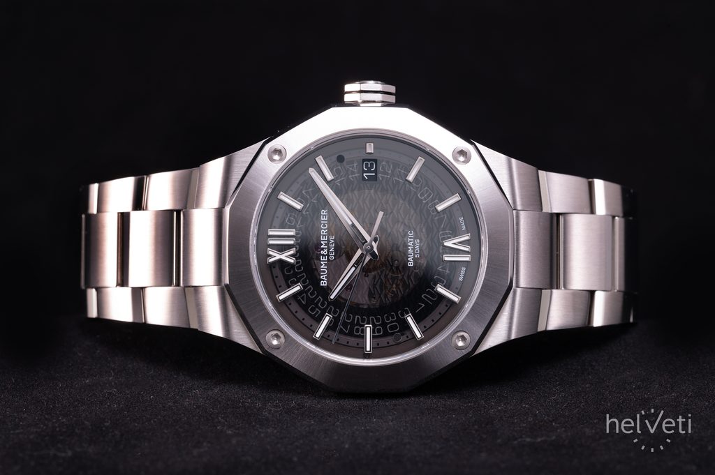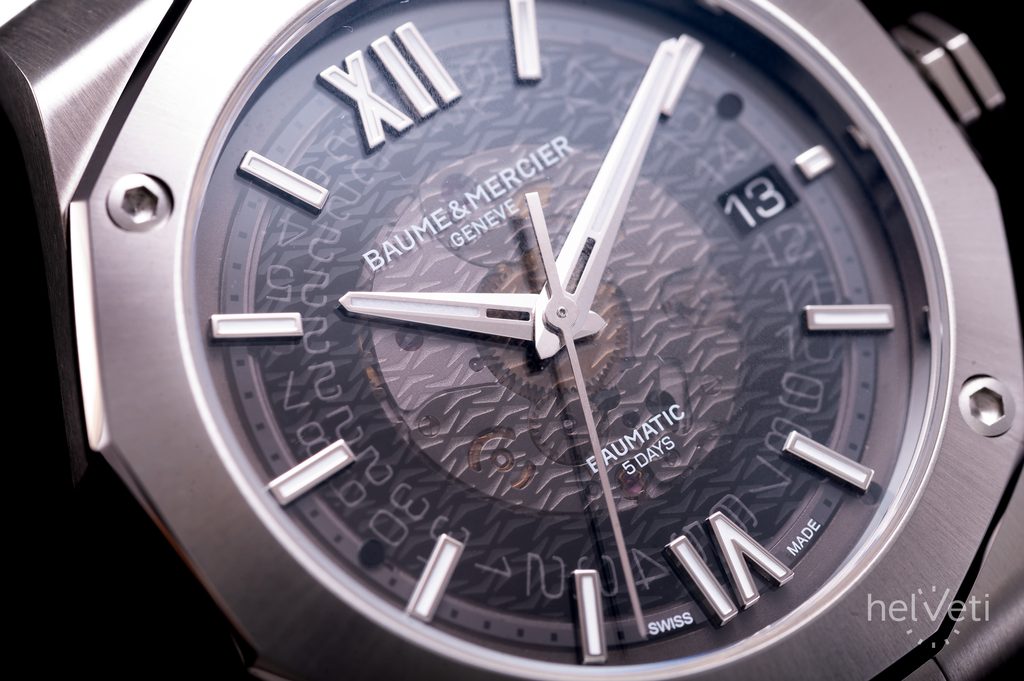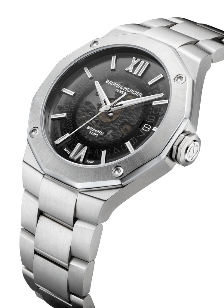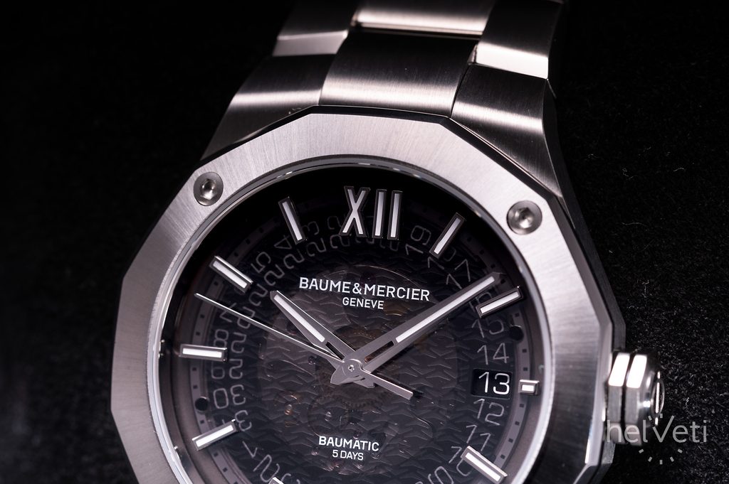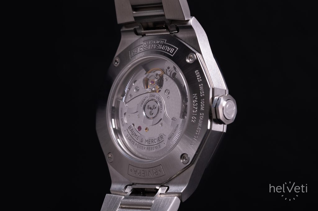 Model Baume & Mercier Riviera M0A10702 má safírový průhledný číselník kouřově šedé barvy, odhalující pohled do nitra hodinek. O přehlednost se starají kontrastní stříbrné ručky a plastické indexy na hodinových pozicích. Hodinky pohání mechanický strojek vlastní výroby Baumatic BM13-1975A s úctyhodnou rezervou chodu 120 hodin. Strojek s automatickým nátahem a frekvencí 28800 polokmitů za hodinu nabízí možnost nátahu korunkou, funkci zastavení vteřinovky při nařizování času (hacking) a data na pozici 3. hodiny.
