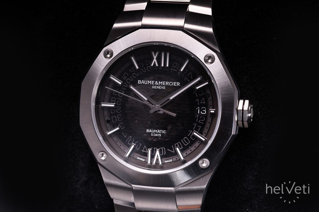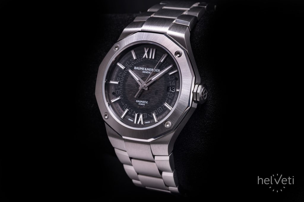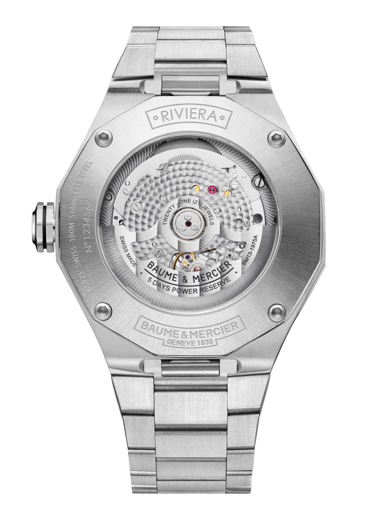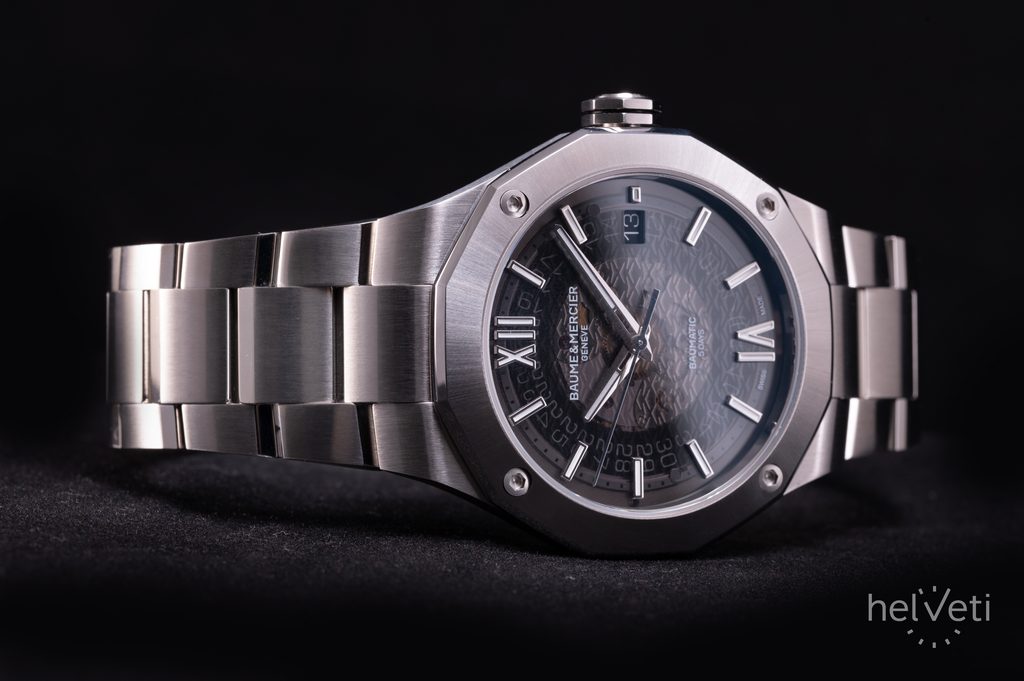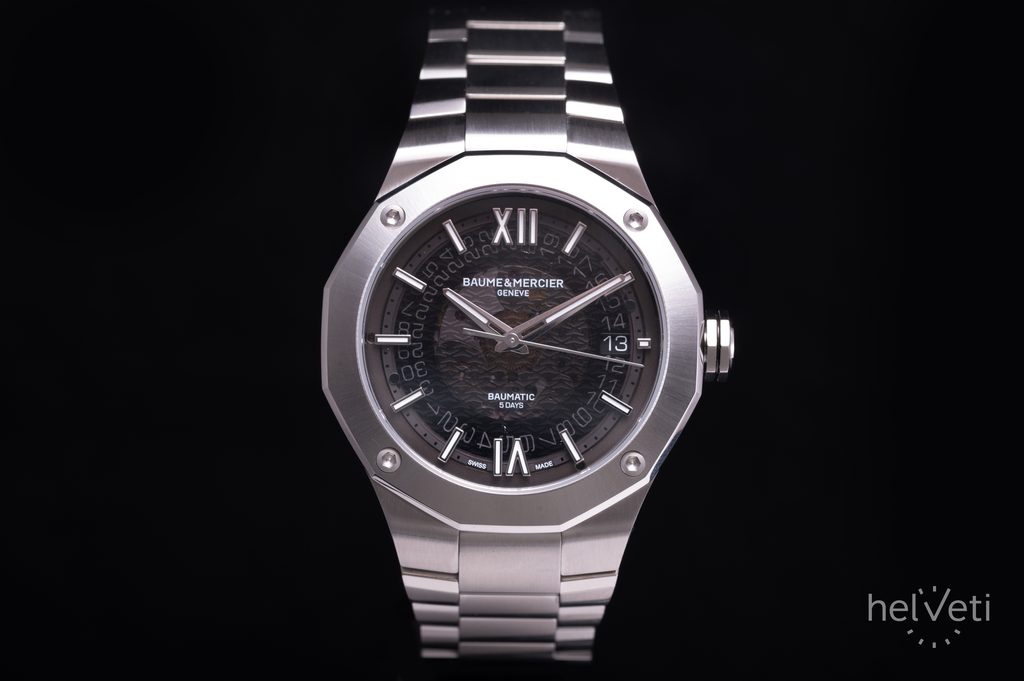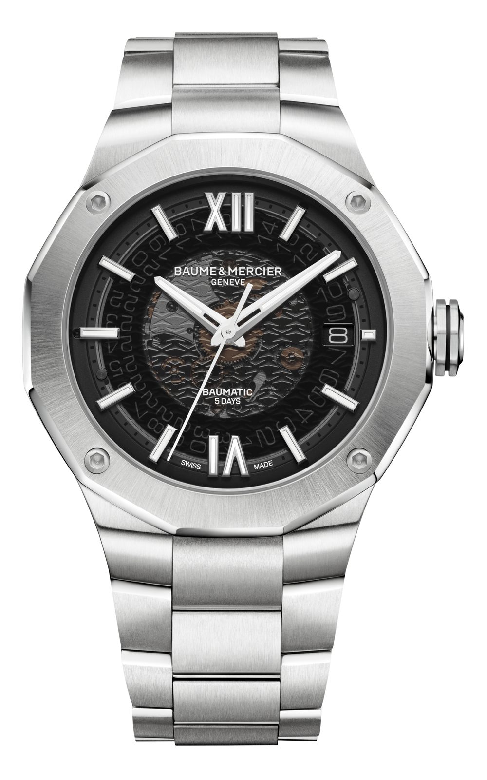 Model Baume & Mercier Riviera M0A10702 má safírový průhledný číselník kouřově šedé barvy, odhalující pohled do nitra hodinek. O přehlednost se starají kontrastní stříbrné ručky a plastické indexy na hodinových pozicích. Hodinky pohání mechanický strojek vlastní výroby Baumatic BM13-1975A s úctyhodnou rezervou chodu 120 hodin. Strojek s automatickým nátahem a frekvencí 28800 polokmitů za hodinu nabízí možnost nátahu korunkou, funkci zastavení vteřinovky při nařizování času (hacking) a data na pozici 3. hodiny.