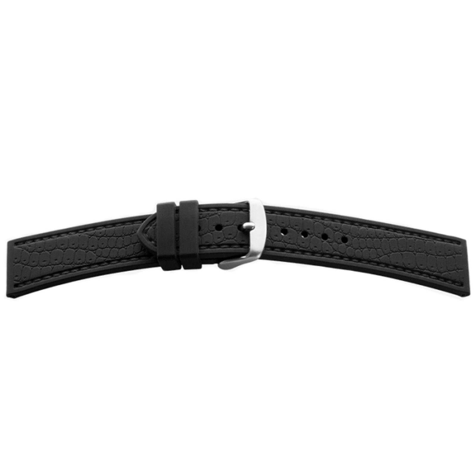 Silikonový řemínek BEAR černé barvy s "kroko" vzorem se stříbrnou sponou. Řemínek je u pouzdra široký 18 mm a ke sponě se zužuje na 16 mm.