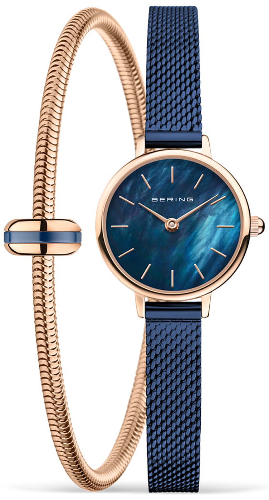 Vyjímečný dárkový set Bering Classic 11022-367-SET19. Sada obsahuje drobné hodinky s PVD úpravou v barvě růžového zlata na pouzdře a modré na náramku, a k tomu okouzlující ladící náramek s korálkem z vysoce kvalitní nerezové oceli. Oba kusy dokonale ladí pro elegantní a vynikající vzhled. Tato sada dá obdarované vědět, jak hluboké city k ní cítíte.