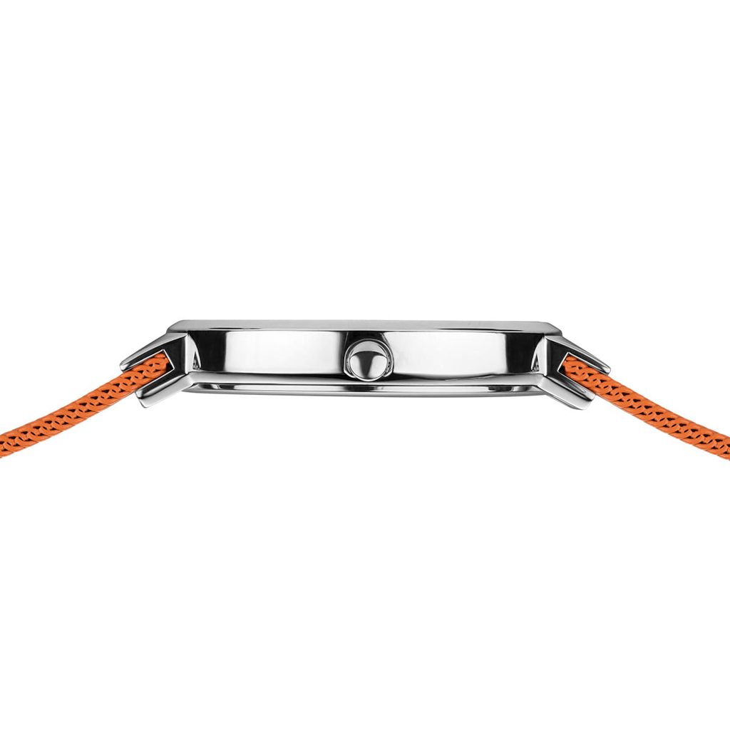 Pouzdro hodinek o průměru 31 mm je vyrobeno z kvalitní a odolné nerezové oceli, která je opatřena IP povrchovou úpravou ve stříbrném odstínu v lesklém provedení. Nekomplikovaný oranžový číselník s kovovým efektem hodinek je dokonalým podkladem pro štíhlé ručky, jenž skvěle ladí se vzhledem pouzdra.