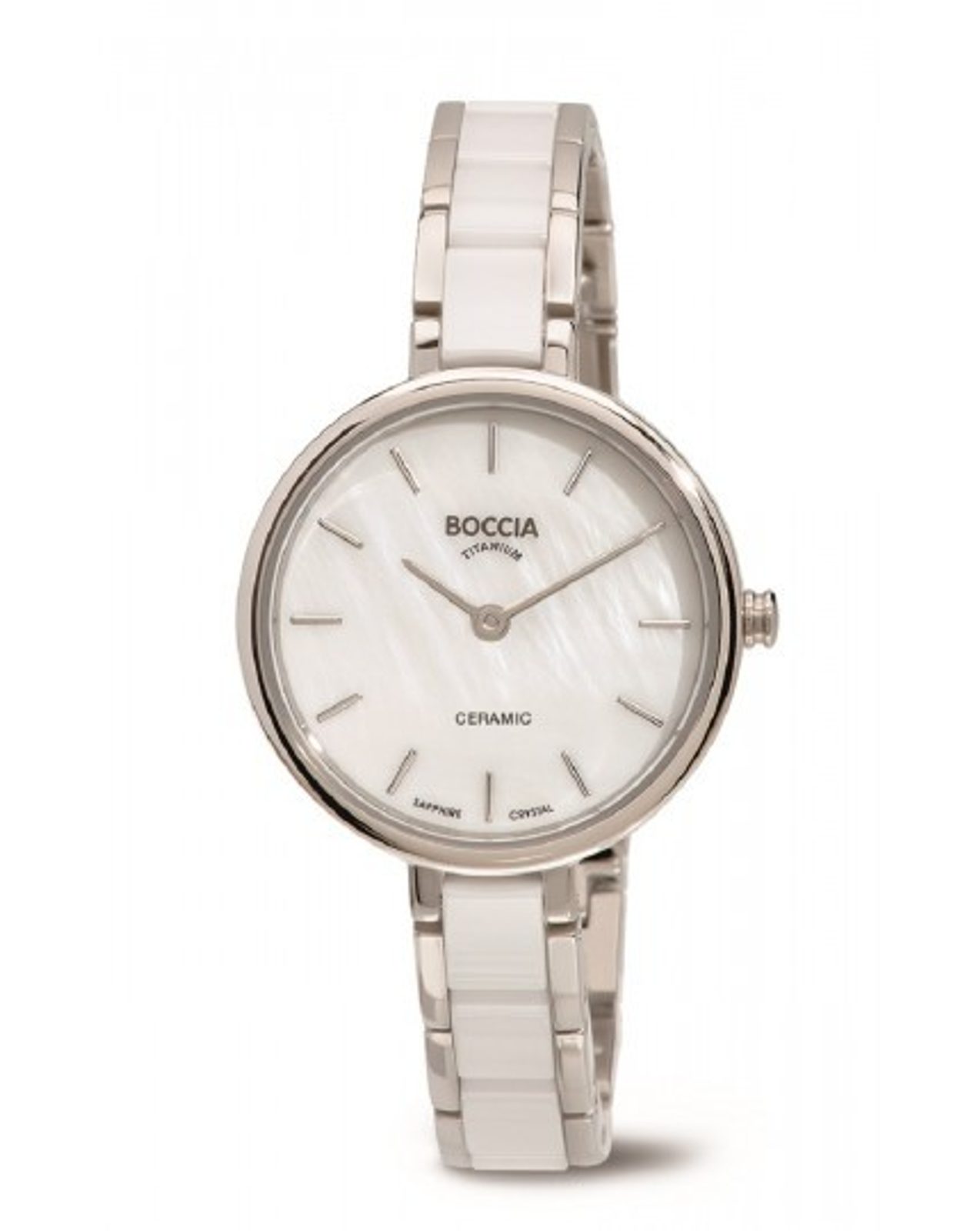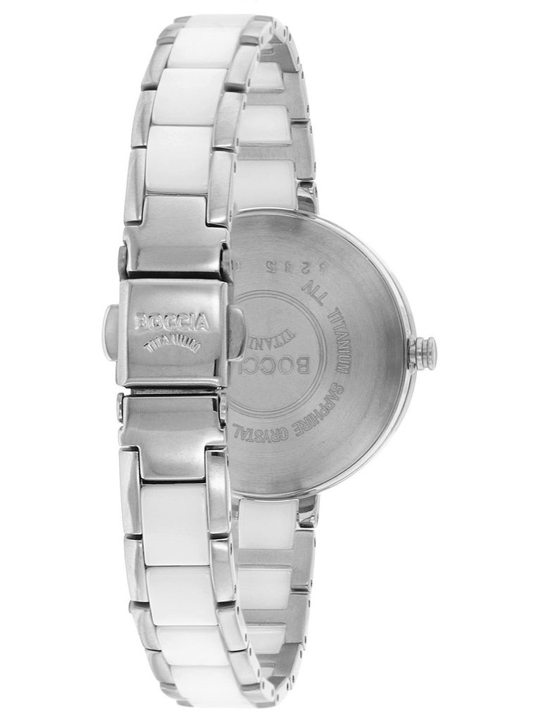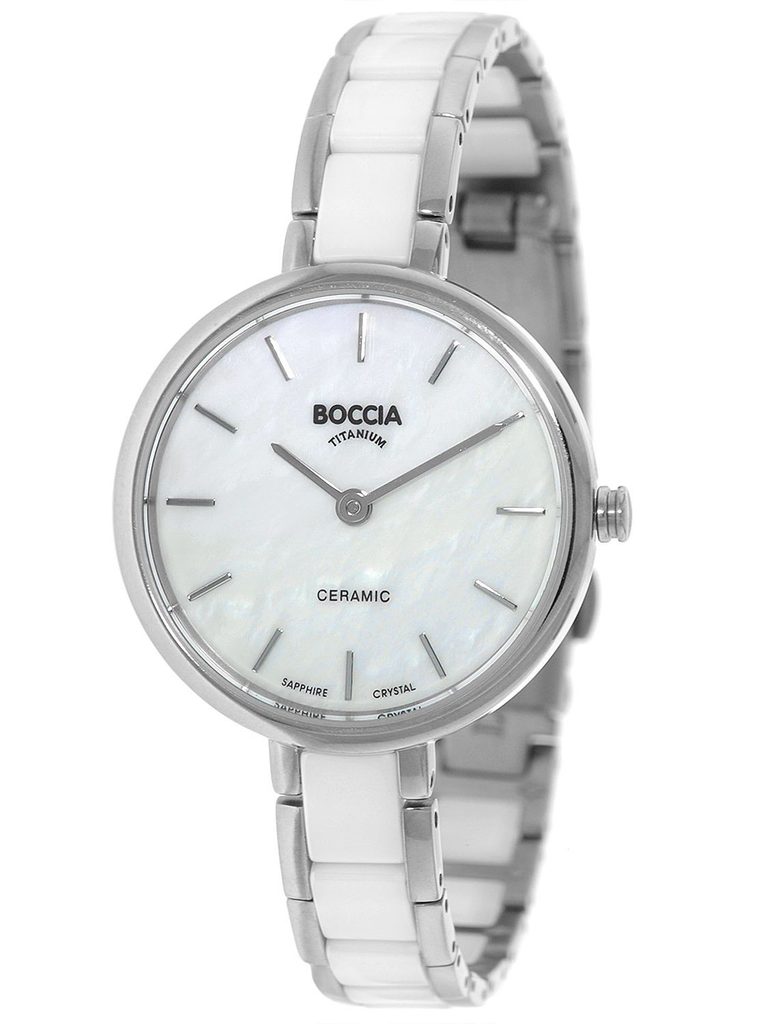 Dámské hodinky Boccia Titanium 3245-01 si své majitelky získává především elegantním zpracováním titanu a keramiky. Ciferník bílé barvy chrání safírové sklíčko. Vodotěsnost tohotu modelu je 50 m (určeno pro koupání do 1metru).