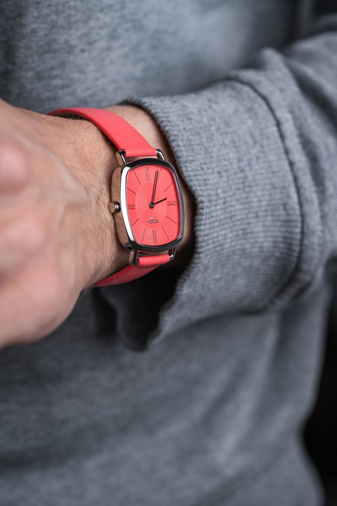 Hranatý číselník nese svěží červený odstín, na kterém dokonale vyniknou stříbrné ručky i štíhlé indexy. Vše chrání kvalitní minerální sklo.