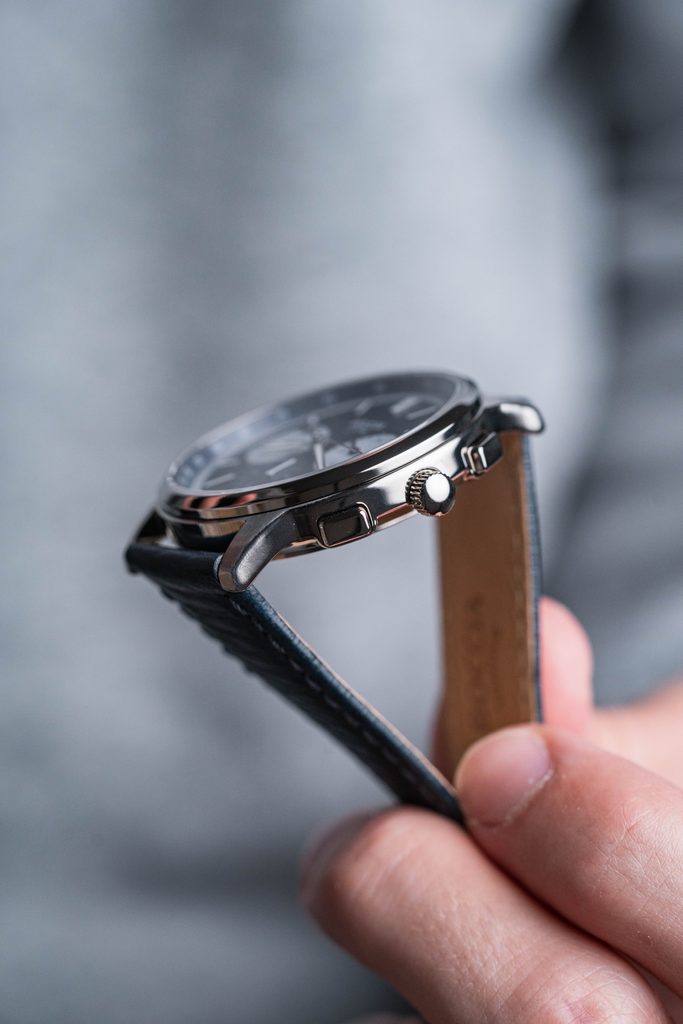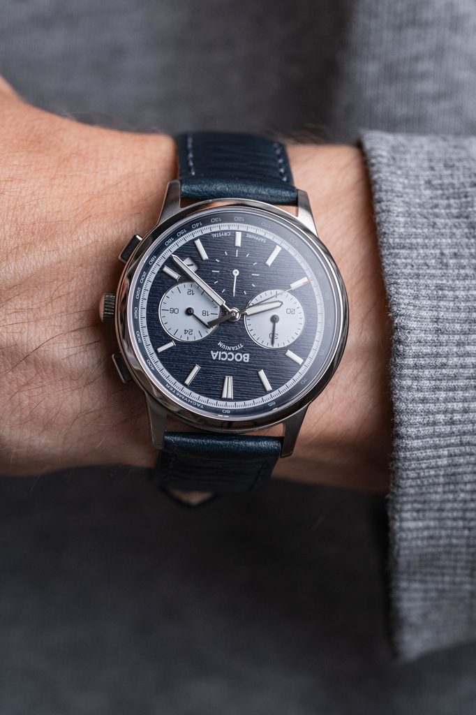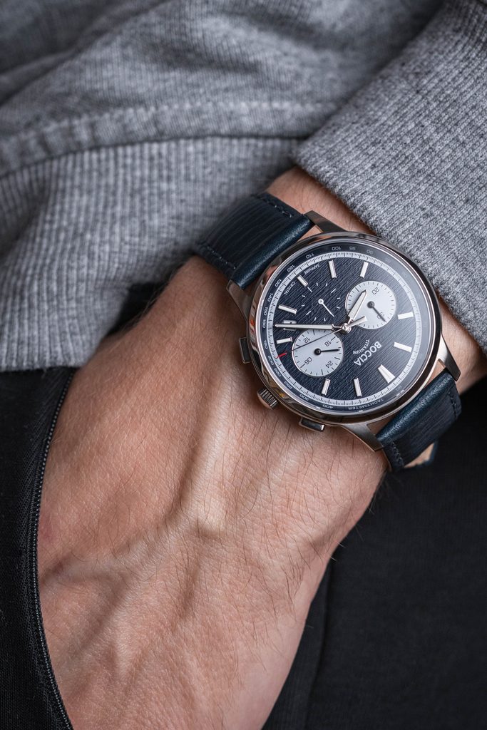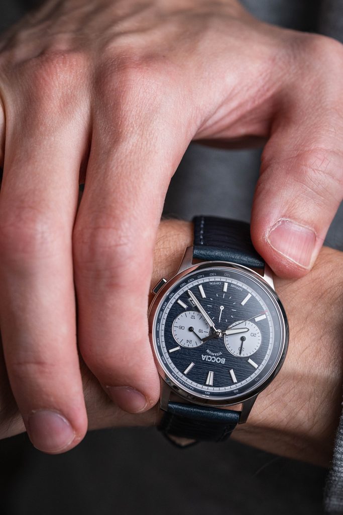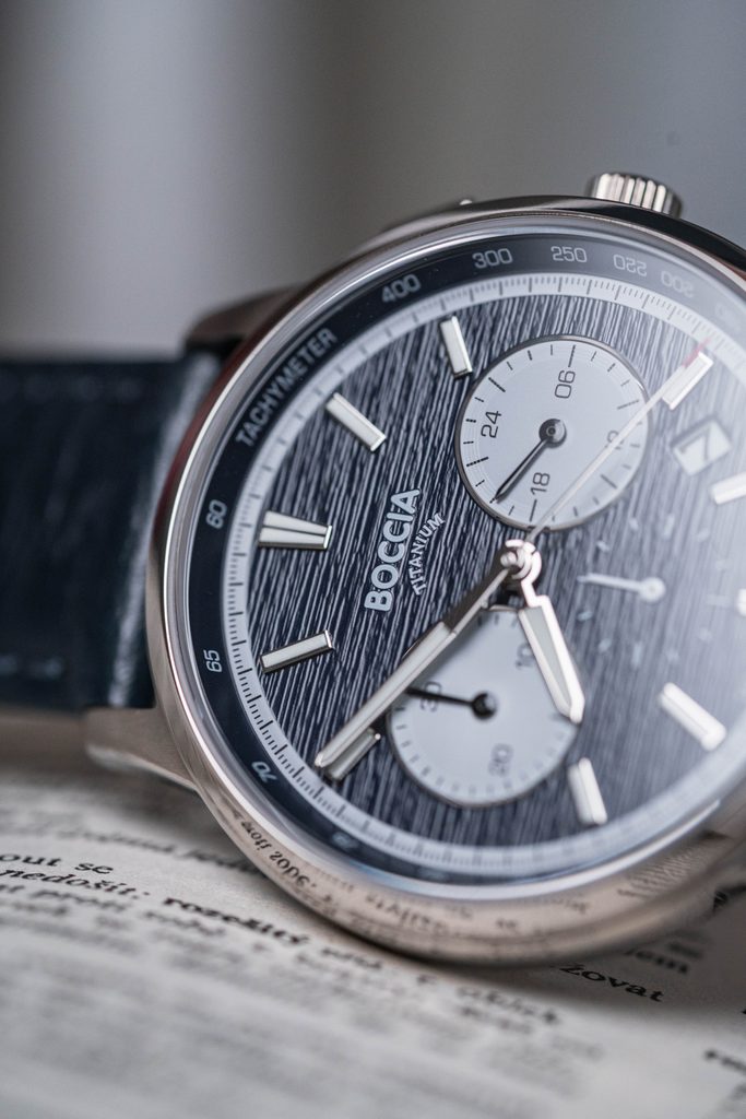 Hodinky mají kulaté titanové pouzdro o průměru 40 mm, které dokonale ladí k modrému číselníku se zajímavou strukturou evokující kůru stromů. Na něm se kromě výrazných indexů a ruček s luminiscenční vrstvou nachází také štíhlá vteřinovka s červeným zakončením, datumové okénko mezi 4. a 5. hodinou a tři subciferníky s funkcí stopek, tachymetru a 24h formátu. Vše pak chrání odolné, téměř nepoškrabatelné safírové sklíčko.