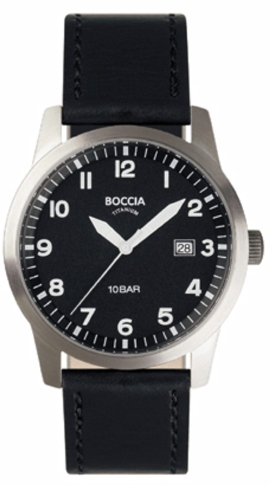 Pánské hodinky Boccia Titanium 597-03 mají černý ciferník s bílými indexy, na kterém se nachází také ukazatel data. Titanové pouzdro skvěle doplňuje černý kožený řemínek. Hodinky jsou vodě odolné do 10 atmosfér.
