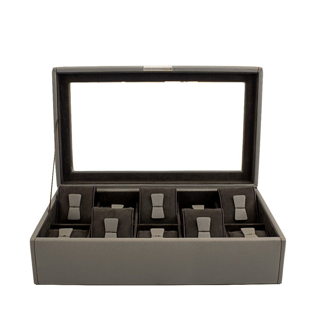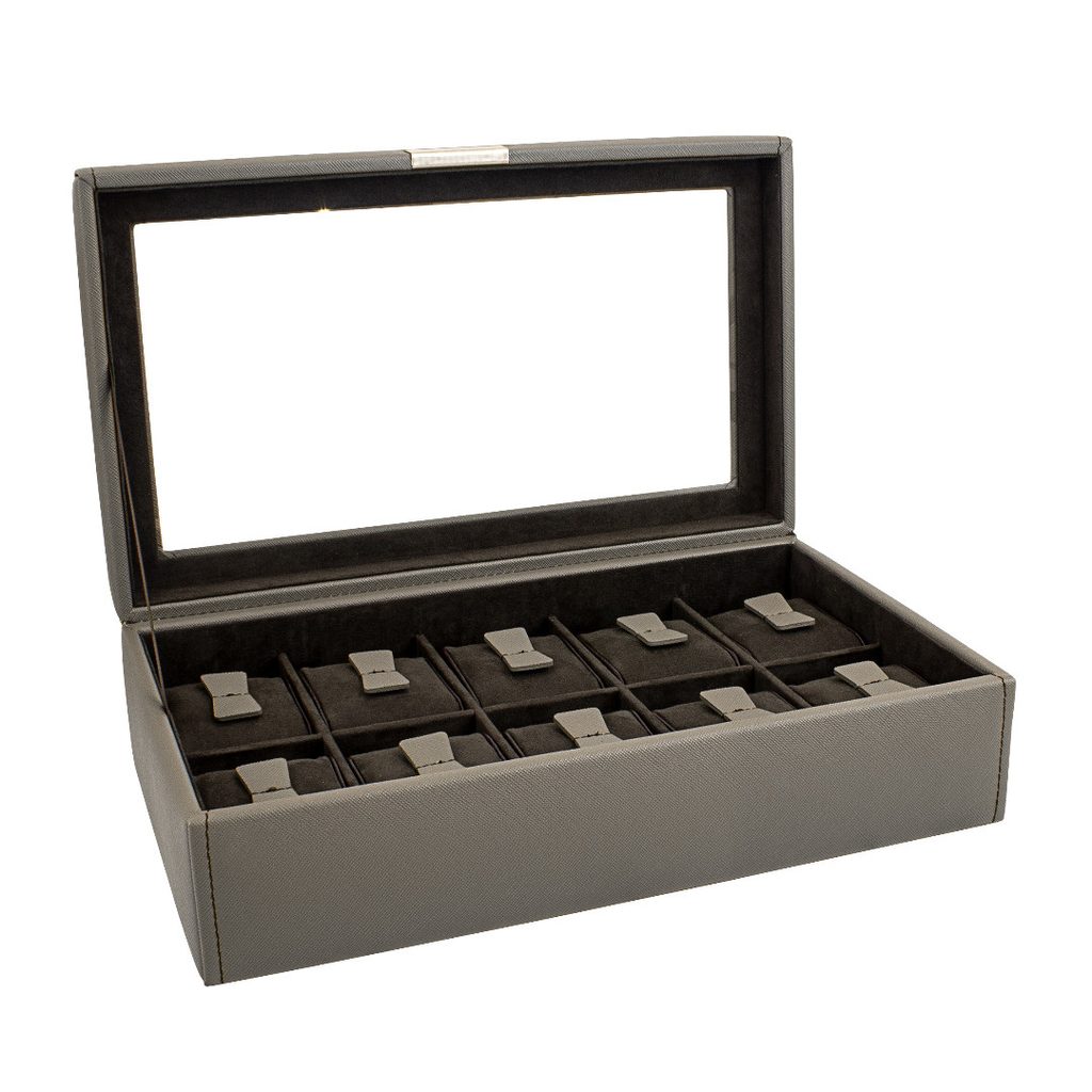 Elegantní box na hodinky Friedrich Lederwaren Bond 20113-3 s průhledným víkem pro 10 kusů hodinek. Vyrobeno z tmavě šedého syntetického materiálu se tmavým semišovým interiérem.