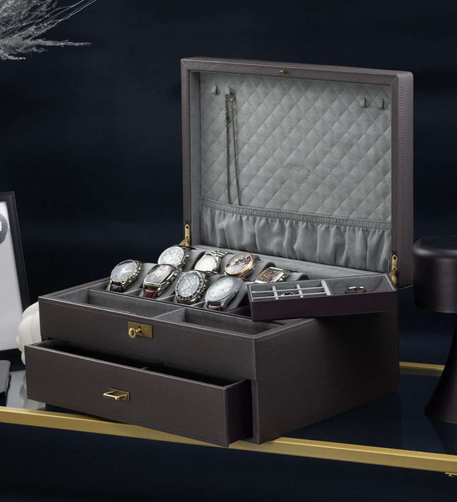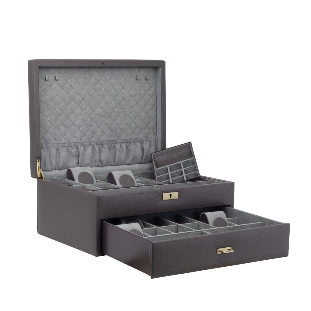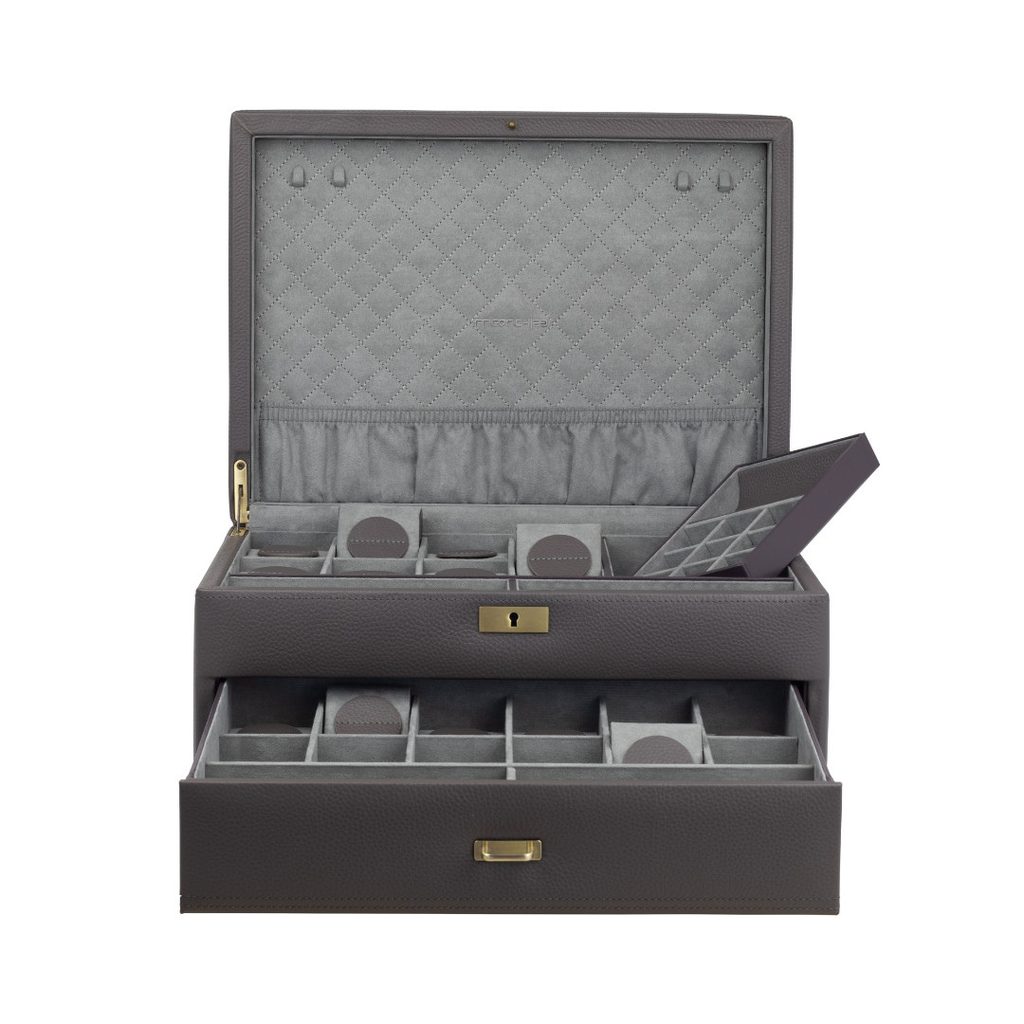 Exkluzivní box Friedrich Lederwaren Dynasty 27035-9 z modelové řady Dynasty, která vznikla k výročí 40 letům značky Friedrich 23. Jedná se o uzamykatelný box na hodinky, chytré hodinky, šperky a brýle. Základna je z MDF dřeva, která je potažena kvalitní kůží v šedé barvě. Do boxu lze uložit až 20 kusů hodinek, dále obsahuje 2 přihrádky na brýle, odnímatelnou přihrádku na manžetové knoflíčky s prostorem pro uložení prstenů či kravatových spon a pod ní další prostor pro jiné cennosti.