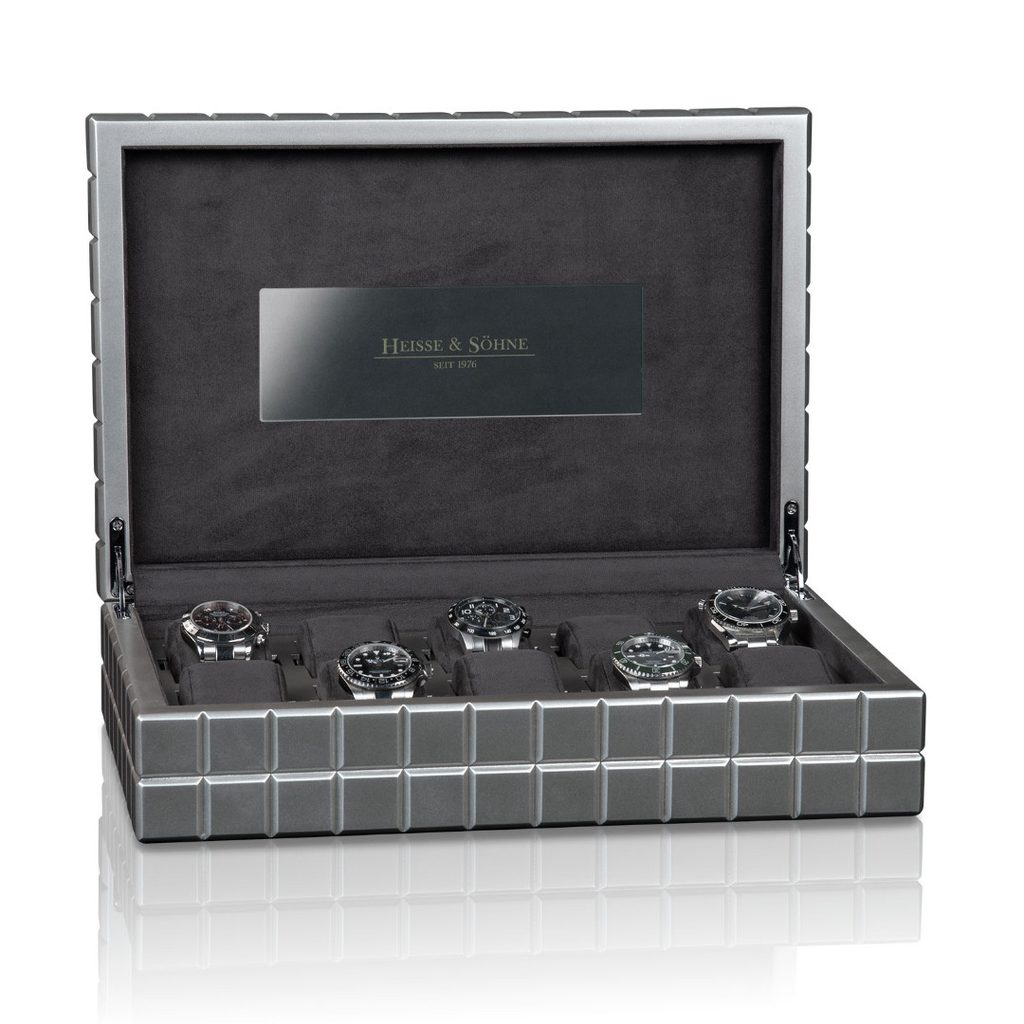 Se svým elegantním lakovaným povrchem v šedé barvě plynule splývá s jakoukoliv stylovou atmosférou. Kazeta s prostorem až pro 10 hodinek nabízí jak dostatek úložného prostoru, tak optimální ochranu. Polštářky hodinek jsou pokryté luxusním sametem, chrání tak řemínek i zadní část pouzdra hodinek před poškrábáním. Kvalitní pochromované prvky na obou stranách polštářků zabraňují jejich prokluzování, čímž je zajištěno, že jsou všechny hodinky vždy ve správné pozici.