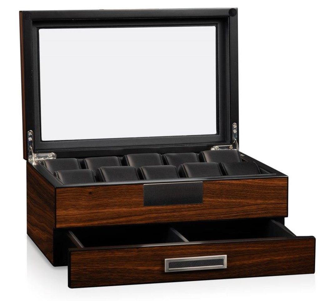 Elegantní box na hodinky Heisse & Söhne Monteray 10+ 70019-202.148 na 10 kusů hodinek. Víko boxu je prosklené. Vyrobeno z dřevěné dýhy černé barvy, se semišovým interiérem a kovovými detaily na víku. Box navíc obsahuje úložný prostor pro další drobnosti, např. manžetové knoflíčky, kravatové spony, prsteny atd.