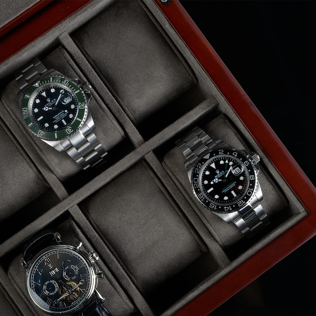 Vysoce kvalitní hodinkové polštářky potažené kůží mají šířku 50 mm, a proto je lze použít téměř pro všechny hodinky. Víko boxu má průhled z minerálního skla.