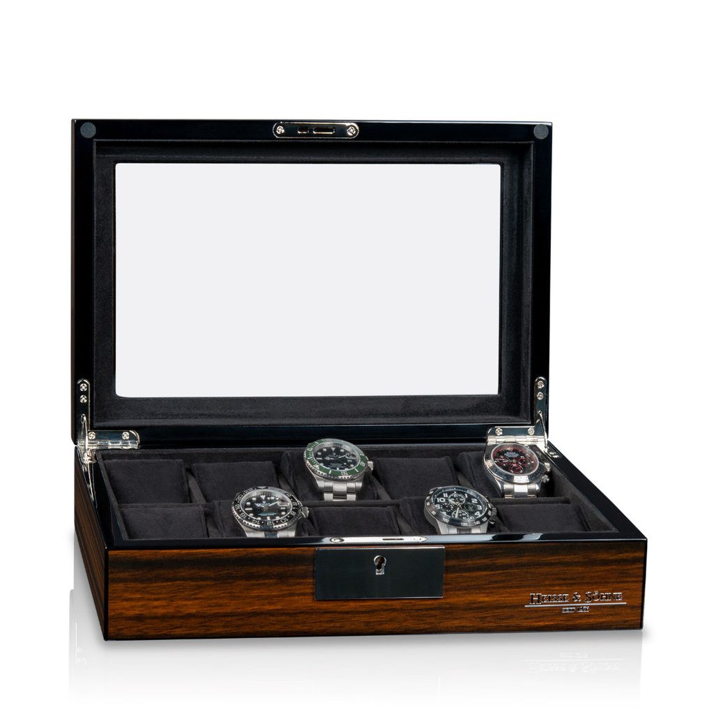 Box na hodinky Heisse & Söhne Tenor 70019-196.159 pro 10 kusů hodinek. Boxy na hodinky z řady Tenor jsou dokonalým řešením pro milovníky hodinek, kteří chtějí bezpečně a stylově uložit své cenné hodinky. Díky důmyslnému zapuštěnému skleněnému průzoru si můžete hodinky kdykoli prohlédnout, aniž byste museli kazetu otevírat.