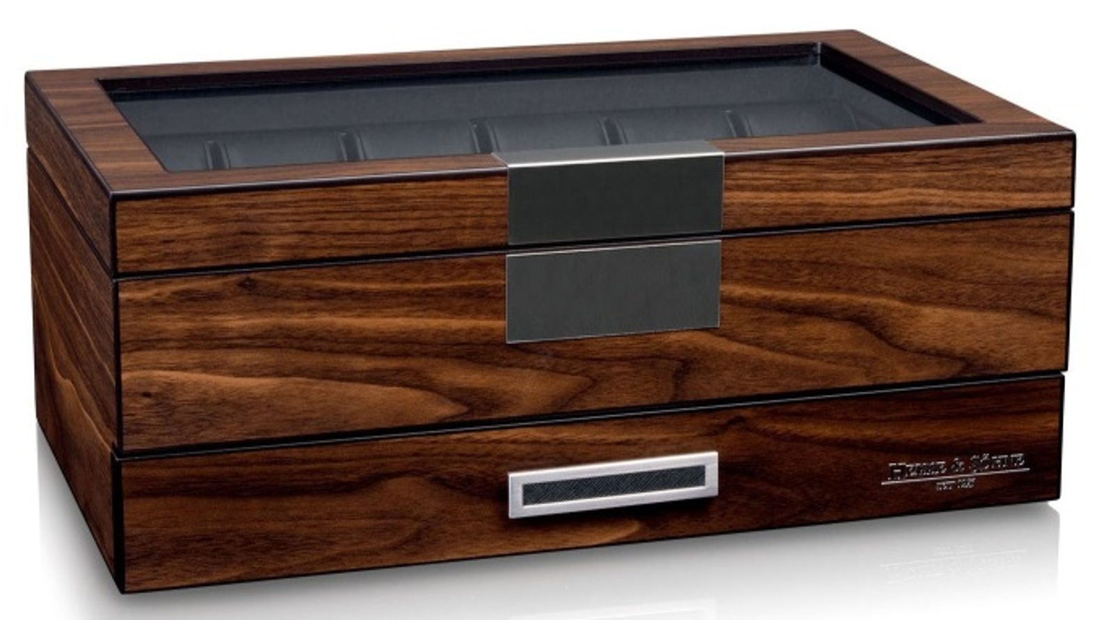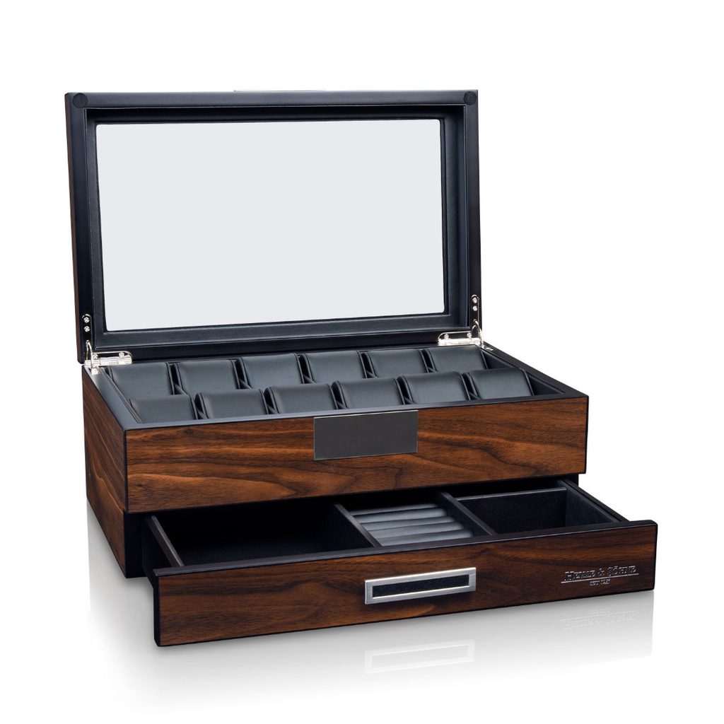 Box na hodinky a šperky Heisse & Söhne Vegas 12+ 70019-187.159 je dokonalou symbiózou stylu a funkčnosti, určenou pro náročné milovníky exkluzivních doplňků. Box nabízí prostor pro uložení 12 kusů hodinek. Ve spodní části najdeme další prostor například pro manžetové knoflíčky, prsteny, náramky a další drobnosti.