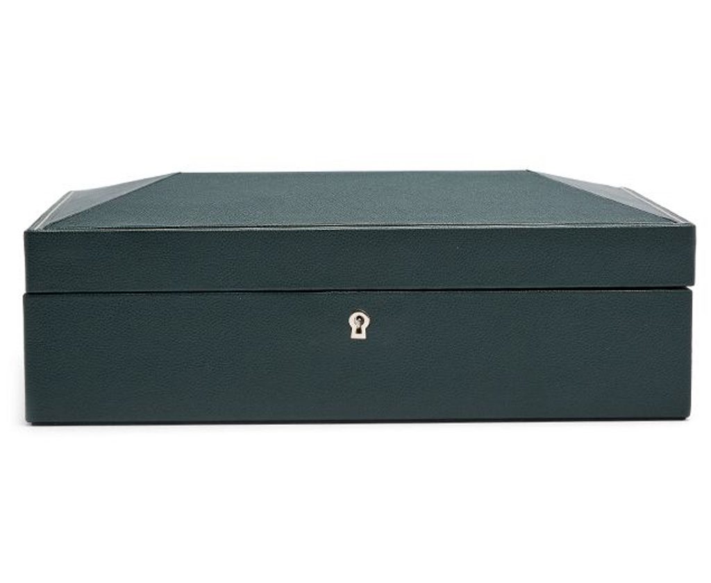 Elegantní box Wolf Wolf British Racing Green 792741 pro 10 kusů hodinek, jehož jeho hlavním rysem je zelená barva mezinárodních motoristických závodů britských vozů závodících v Irsku na počátku 20. století.