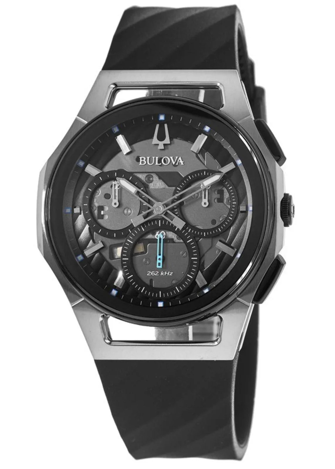 Pánské hodinky Bulova Curv Progressive Sport Chronograph 98A161 upoutají na první pohled především zahnutím pouzdra, které je umožněno díky strojku Curv. Tento strojek je unikátní tím, že je prvním zahnutým strojkem s chronografem na světě.