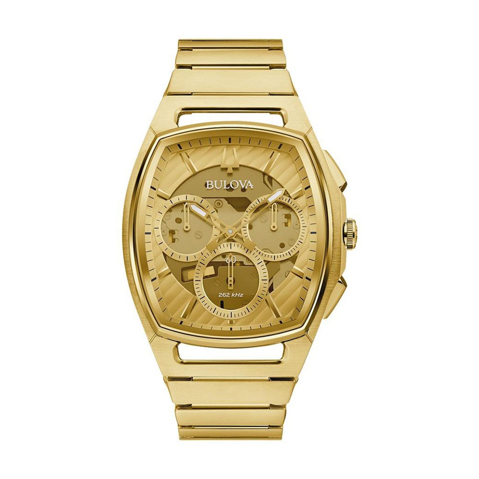 Ocelové pouzdro hodinek Bulova Curv Tank Chronoghraph 97A160 se zlatou PVD úpravou povrchu díky svému zahnutému tvaru ideálně padne na zápěstí, čímž je zajištěna dokonalá pohodlnost. Uvnitř najdeme vysoce výkonný quartzový UHF (Ultra High Frequency) strojek, pracující na frekvenci 262 kHz. To je zhruba 8x více, než u běžných quartzových strojků (32768 Hz). Díky tomu je možné dosáhnout extrémní přesnosti chodu s odchylkou přibližně 10s za rok! Tento strojek dále nabízí také funkci stopek a lze ho pozorovat díky částečně průhlednému číselníku a průhlednému dýnku.