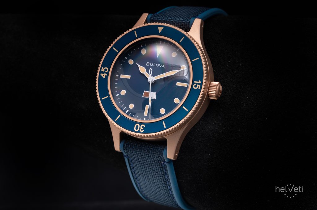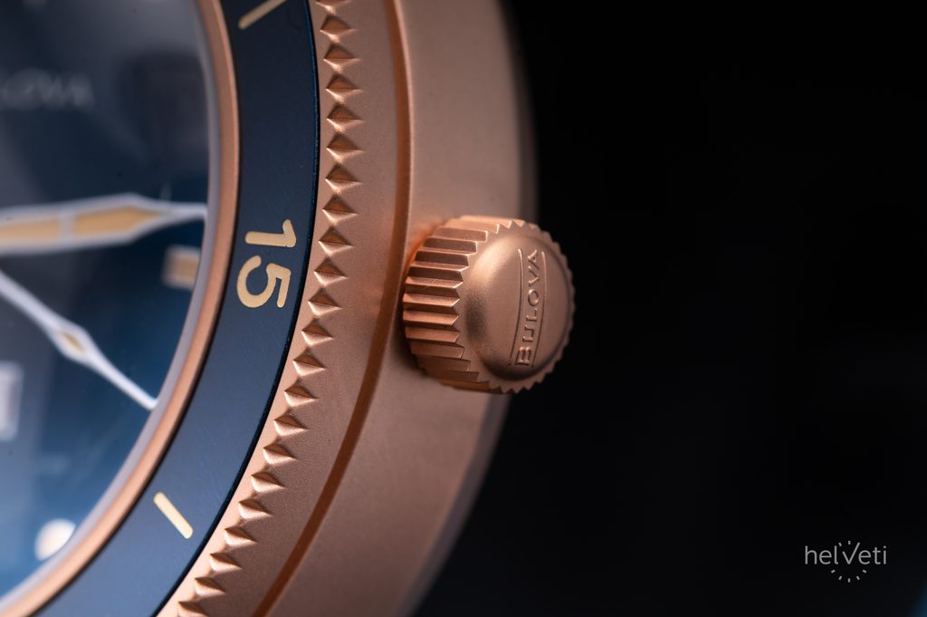 Bulova Mil-Ships 98A325 Bronze přebírají výbavu modelu z padesátých let, avšak přichází ve vylepšeném provedení. Pískované pouzdro hodinek je vyrobené z bronzu CuSn8, materiálu s růžovo-zlatým odstínem připomínajícího měděné potápěčské helmy z 19. století. Bronz je mnohem pevnější než měď časem vytváří přirozenou patinu, která je zároveň ochrannou vrstvou, zvyšující jeho odolnost a jedinečná oxidace povrchu navíc zaznamenává příběh, který spolu s hodinkami píšete. Pouzdro má vrtané nožky pro snadnou výměnu řemínku a doplňuje jej jedinečné dýnko s reliéfem potápěčské helmy a odkazem na 150. výročí značky.