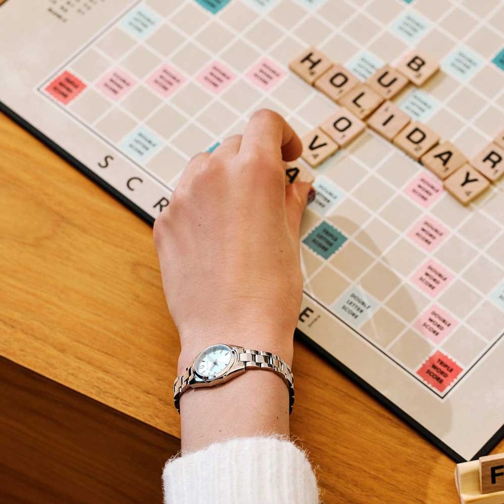 Ledově modrý číselník zaujme nejen barvou, ale také efektem slunečního brusu, který mu dodává živost. Na jeho ploše vynikají jemné a elegantní stříbrné ručky a aplikované indexy na hodinových pozicích. Nechybí ani minutová stupnice natištěná po obvodu číselníku. Ochranu číselníku zajišťuje safírové sklíčko s antireflexní úpravou, které je velmi odolné vůči poškrábání. Ručky hodinek jsou opatřené luminiscencí a usnadňují tak odečet času při zhoršených světelných podmínkách.