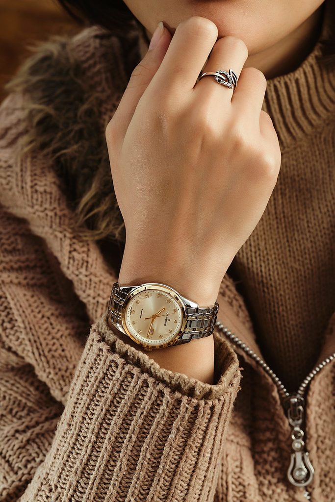 Luxusní vzhled hodinek udává pouzdro a tah z ušlechtilé oceli se zlatou PVD úpravou. Na tradiční pozici 3 se nachází praktický ukazatel data. Zlatý číselník je doplněný třpytivými kamínky a ručičkami s luminiscencí. To vše chrání safírové sklíčko, které je maximálně odolné proti poškrábání. Uvnitř hodinek se skrývá bateriový švýcarský strojek Ronda 585.