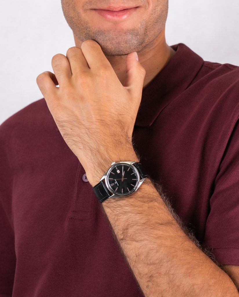 Vodotěsnost 5 ATM udává, že hodinkám neublíží déšť, mytí rukou nebo večerní sprcha. Ocelové pouzdro obepíná elegantní kožený řemínek v černé barvě.